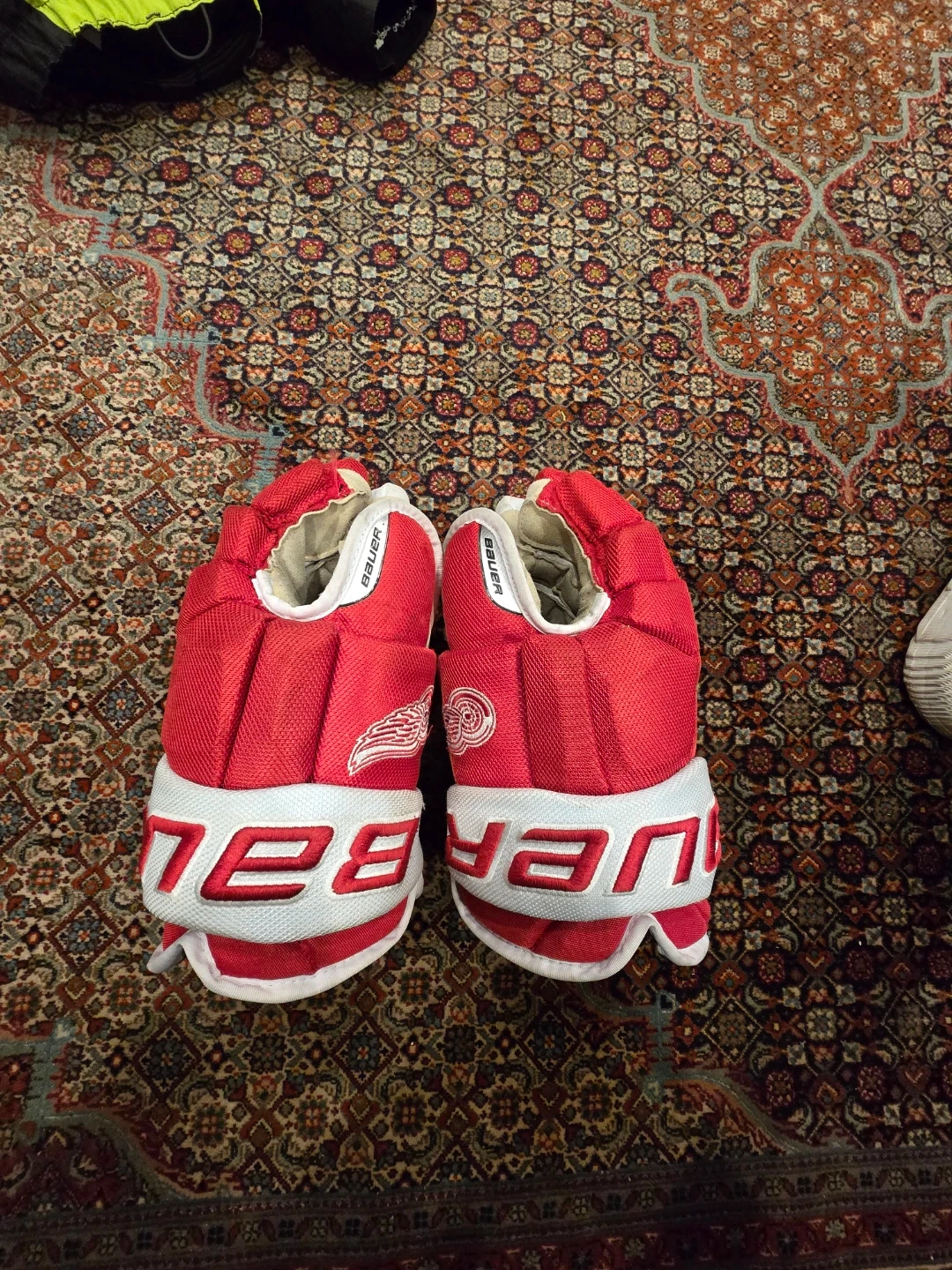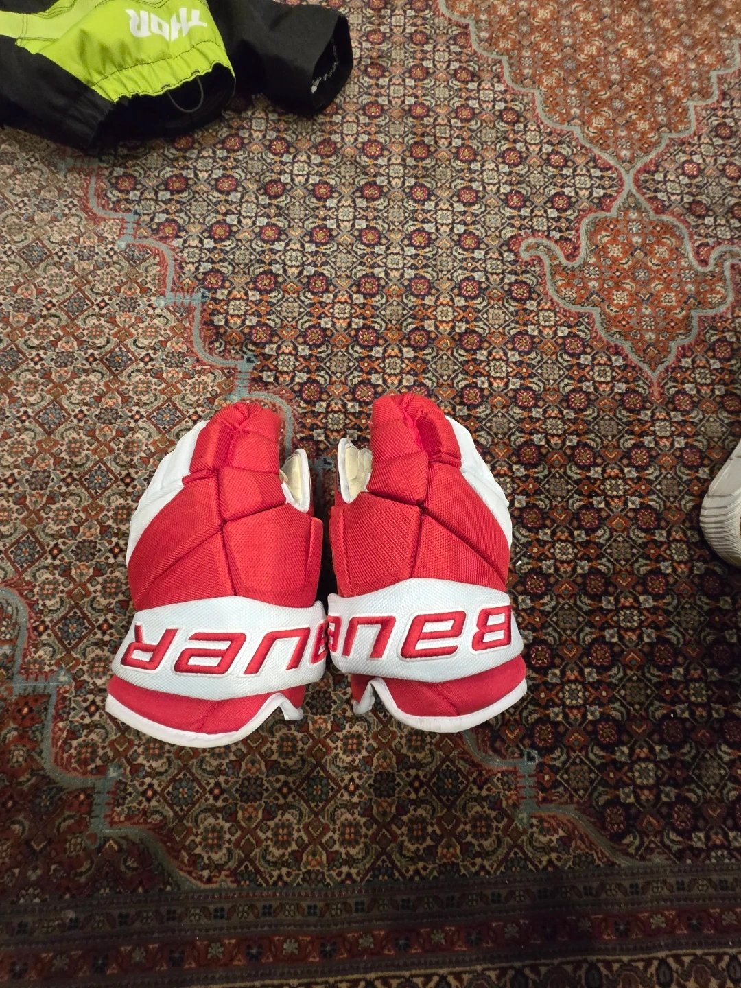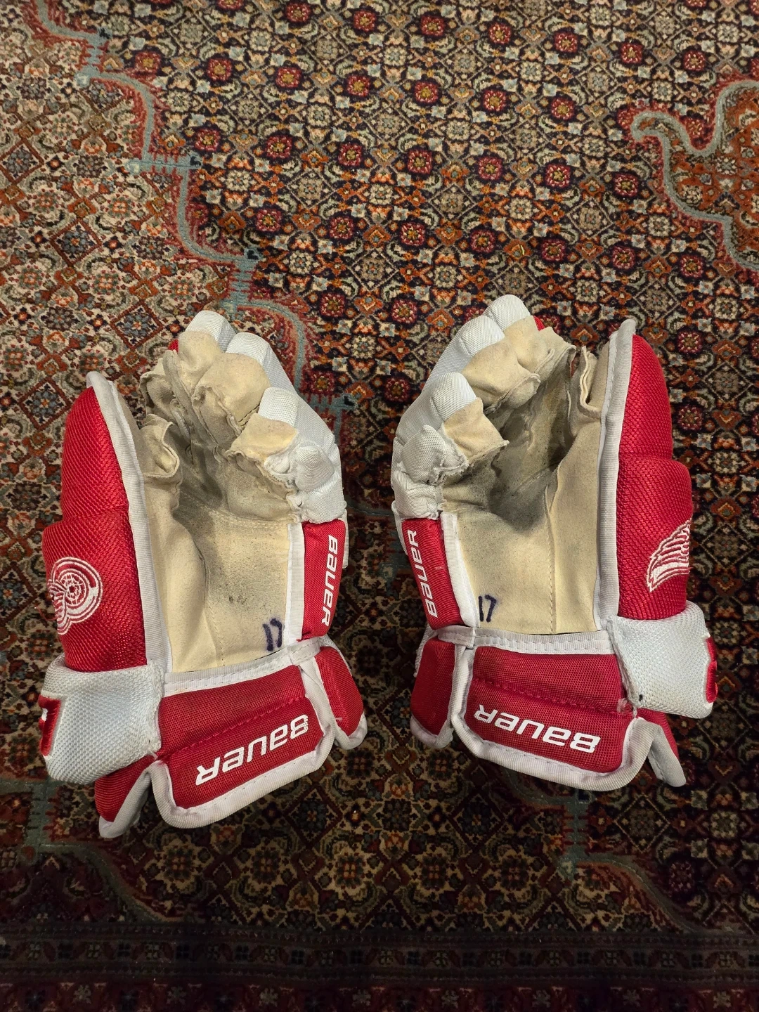 Red and white Bauer VAPOR PRO TEAM hockey gloves. Size is 13" (33cm). These gloves offer solid protection for the rink.