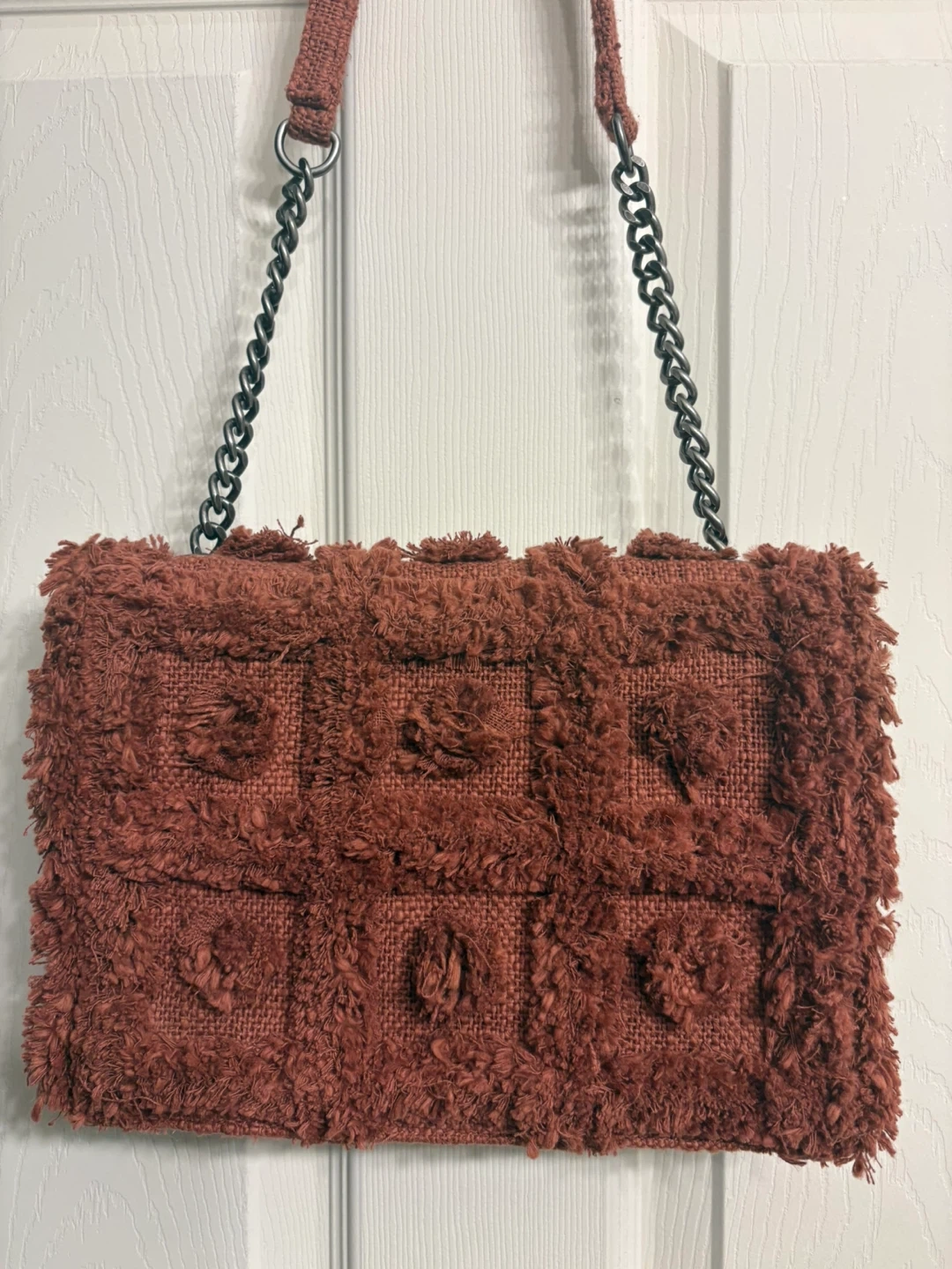 This Zara textured brown shoulder bag has a unique, fluffy exterior with a woven base. It features a secure magnetic snap closure and a stylish metal chain strap. It's roomy enough for your essentials! Perfect “like new” condition. Pick up in Chestermere.