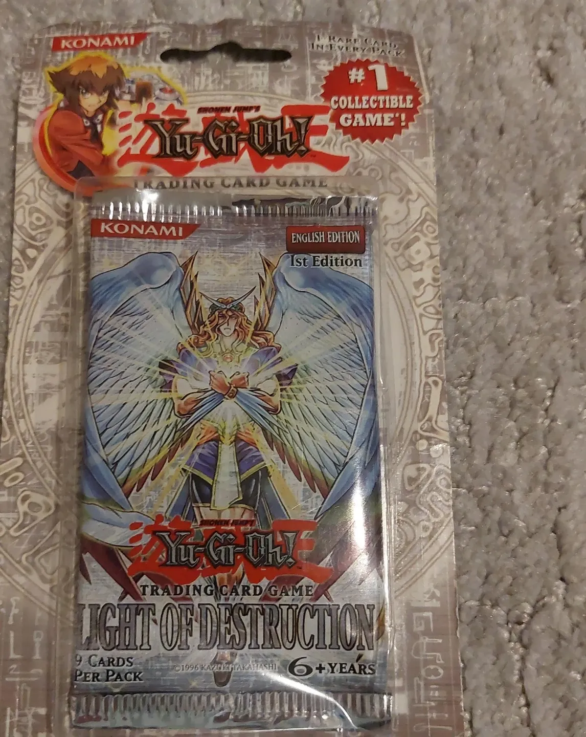 This is a Yu-Gi-Oh! Trading Card Game pack featuring the Light of Destruction set. It's an English edition, 1st edition, and includes 9 cards per pack. The recommended age is 6+ years.