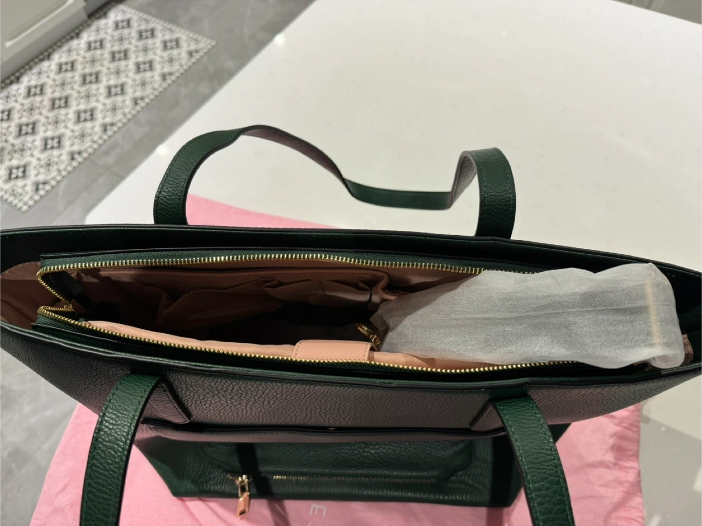 This dark green tote bag from Poppy & Peonies is a stylish and practical accessory. It features multiple interior pockets and a zippered main compartment. Comes with its original dust bag. Brand new. Just bought in February. Bag is too big for intended use.