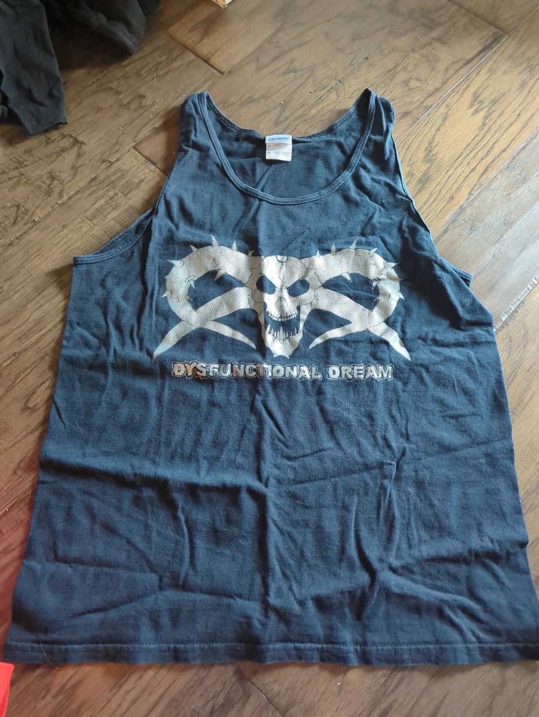 This is a Gildan brand tank top with a "Dysfunctional Dream" graphic featuring a skull and spiky design. It's a size medium. The material is a cotton blend.