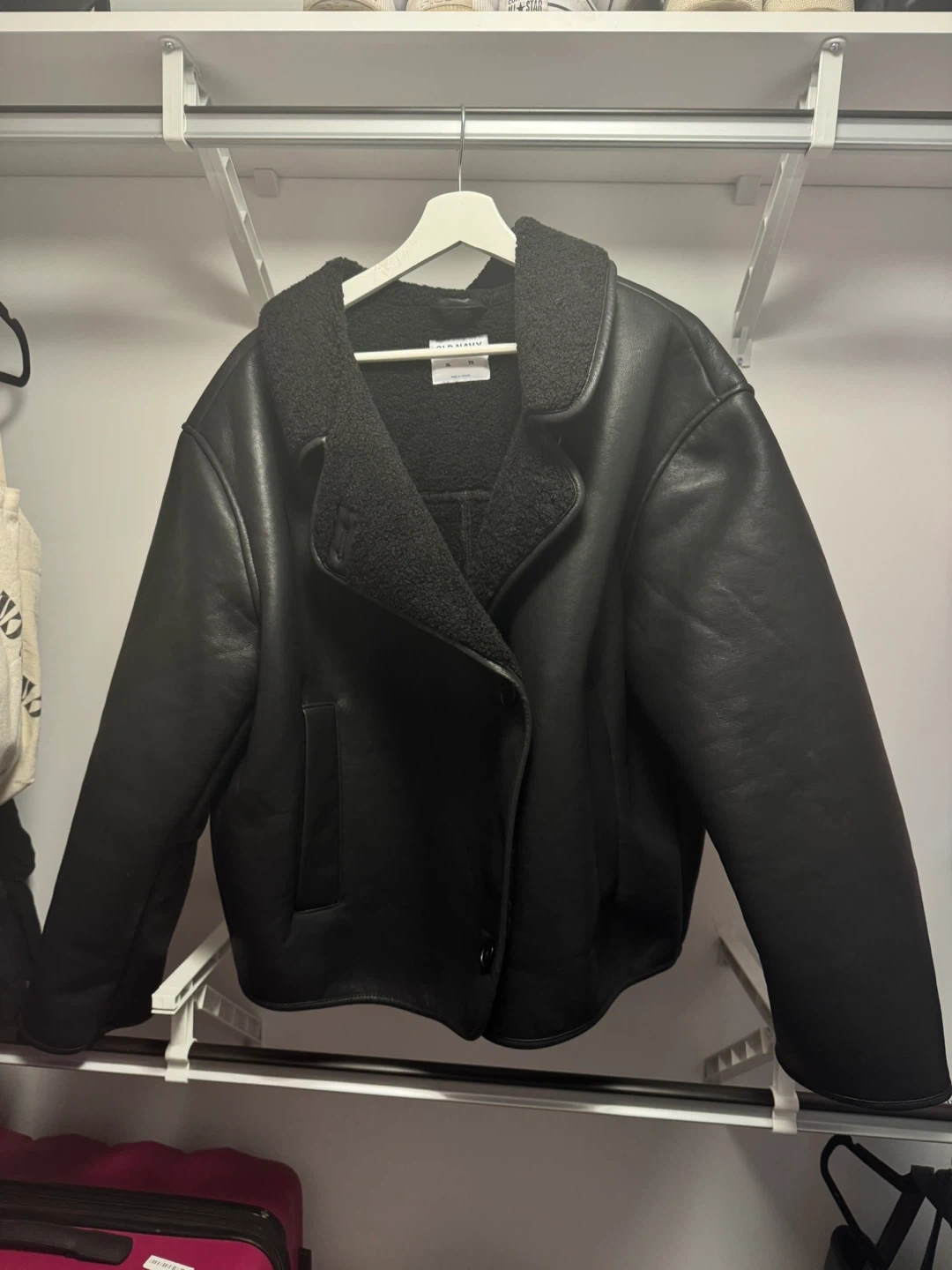 This black Old Navy jacket is faux leather with a cozy sherpa lining. It's size XL/TG. This jacket's great for staying warm on chilly days! I don’t like the fit on me, hope someone else can use it!