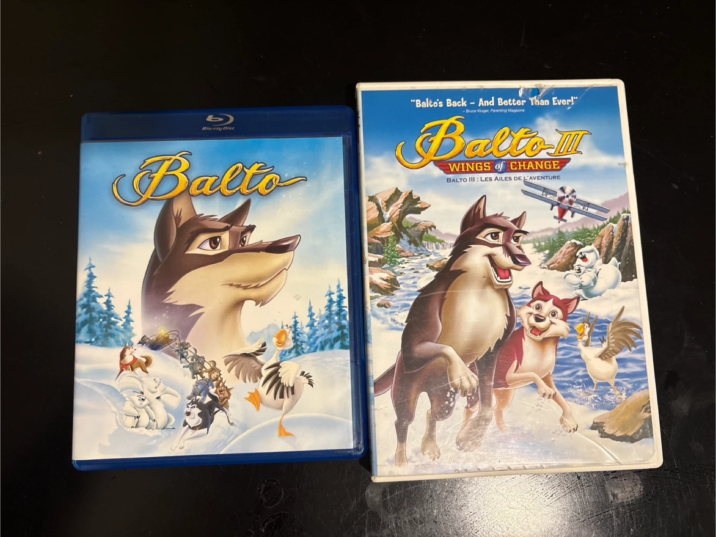 This is a Blu-ray disc for Balto and a DVD for Balto III: Wings of Change. Both films are animated adventures. They're great for family movie nights.