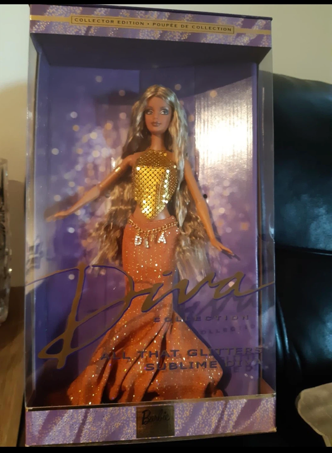 Collector Edition Barbie "All That Glitters" Sublime Diva doll. She's dressed in a sparkling orange gown with a gold sequin halter top. Includes original packaging.