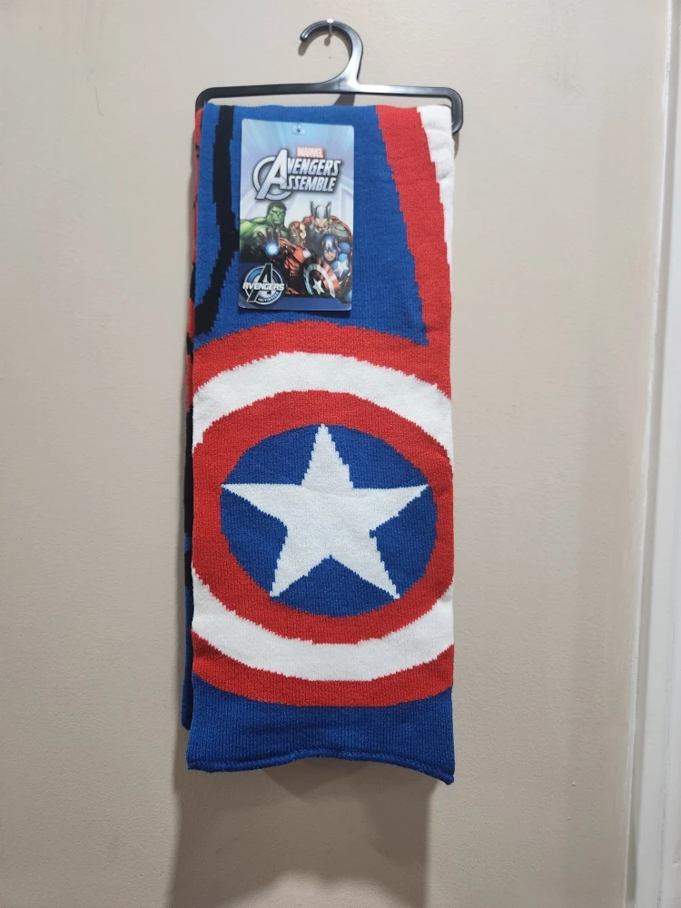 Keep warm with this cozy Marvel Avengers Assemble scarf! It features Captain America's iconic shield design in blue, white, and red. Perfect for any Marvel fan!