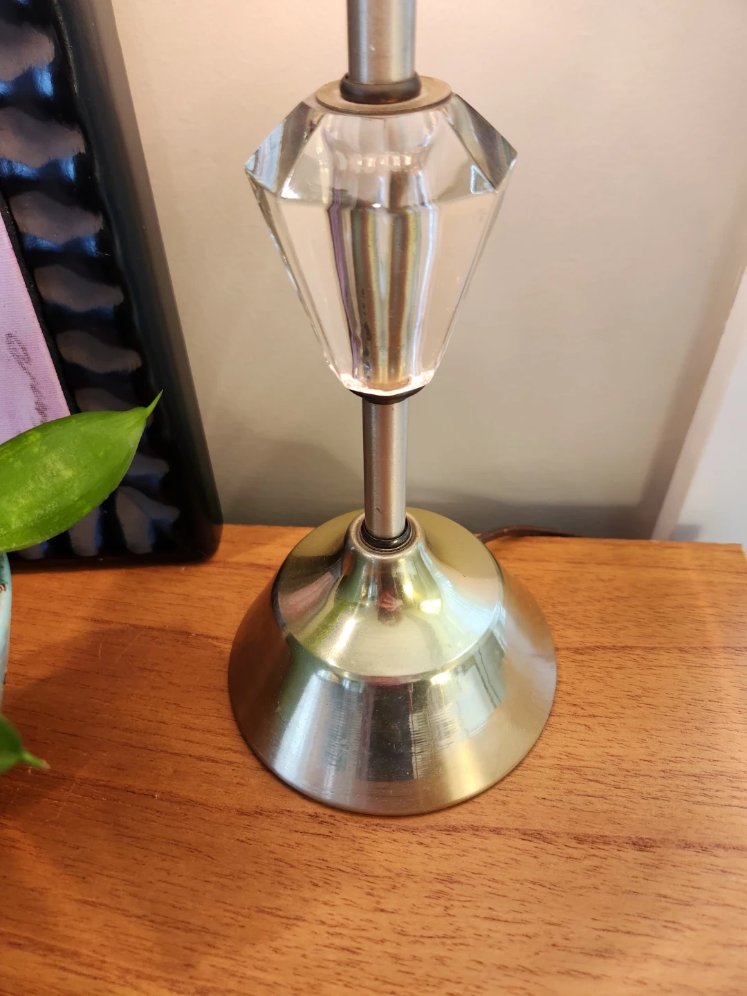 This 1940s micro lamp with a brushed metal base and a decorative crystal style accent. It has a soft green textured fabric lampshade and plenty of vintage style! . Adds great ambient light to a bedroom or living space. 16 inches high, with a 6 inch diameter base makes this piece particularly handy for night stands, mantle, entryways of bookshelves! HANDY & HANDSOME.