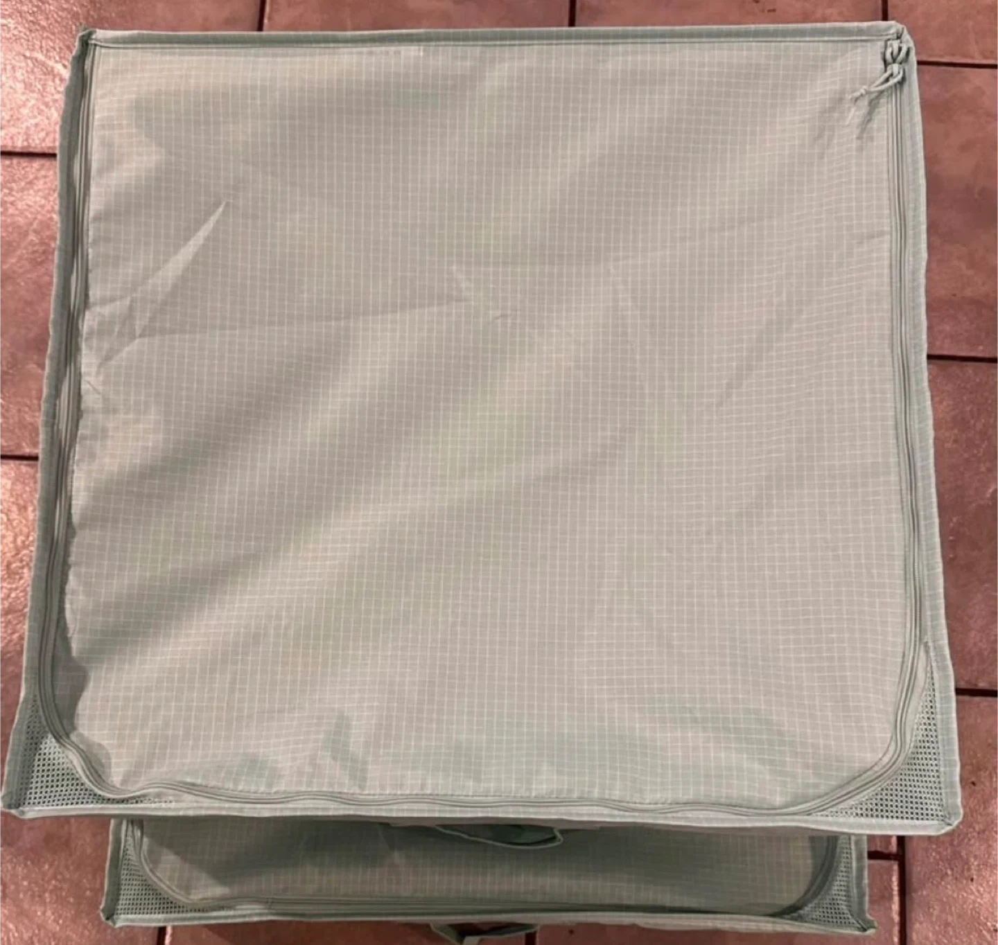 A set of 1sturdy white plastic clothes hangers with a smooth finish. It also includes two light green fabric storage bins with zippered tops and mesh accents. These bins are great for organizing closets or drawers!
