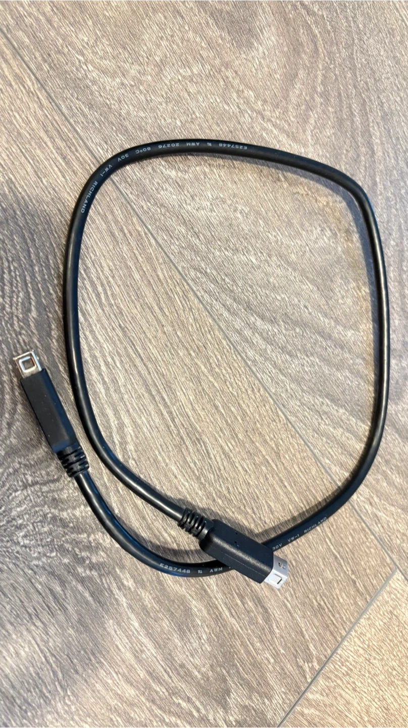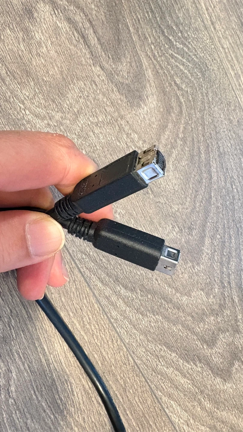 This is a black USB A to Mini USB cable. It's commonly used for connecting older devices like cameras or MP3 players to a computer. The cable is approximately 1 meter long.