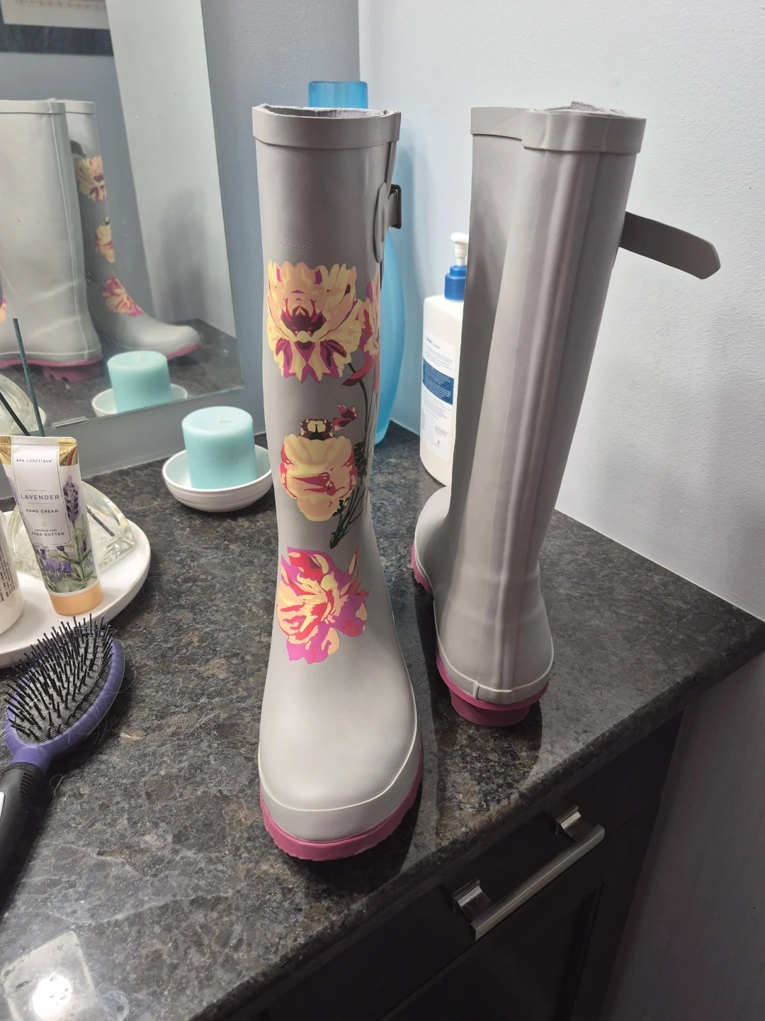 These rain boots are perfect for those wet Canadian days! They're a stylish grey with a lovely floral pattern and pink soles. Size 8.