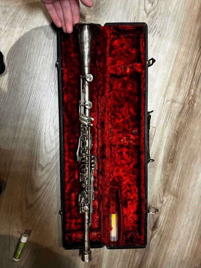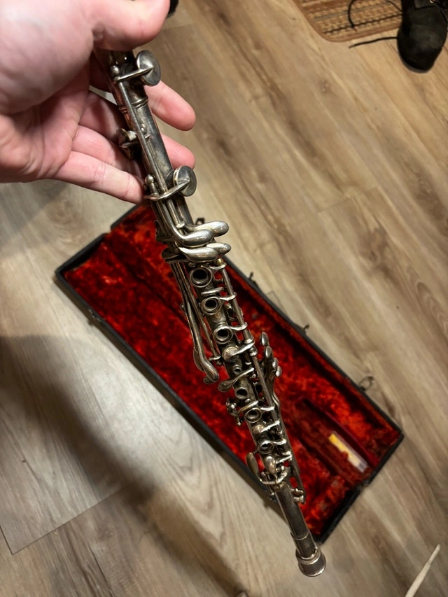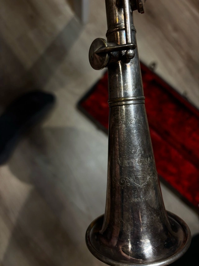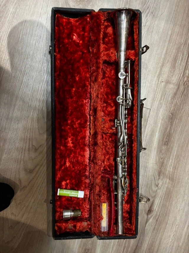 Selling a vintage NATIONAL (engraved “NATIONAL” + “Made in USA”) silver-colour metal woodwind instrument, likely a metal clarinet. It's in used/vintage condition with cosmetic wear and tarnish. This item is UNTESTED / AS-IS. I don't have experience playing and I don't have time to properly test it. I tried blowing into the mouthpiece and got no sound, which could be due to needing the correct setup, parts, reed, or technique. It looks like 2 pieces are missing. Included: the instrument (as shown), a hard case, small accessories shown in photos (old reed box, cork grease, etc.), and the cork/metal piece. Great for someone who restores instruments, needs parts, or wants a vintage project. Pickup in Toronto.
