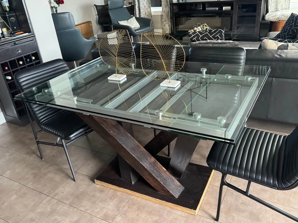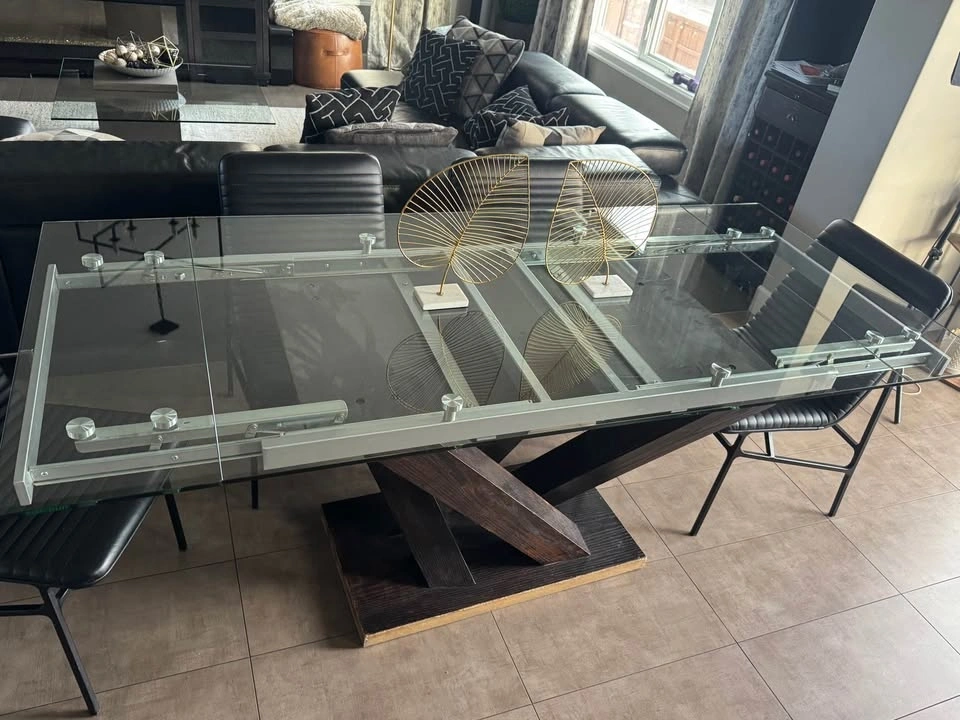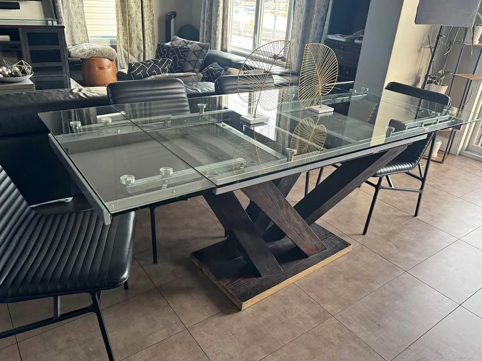 Sleek and modern extendable dining table with a tempered glass top and solid wood base. Perfect for both everyday use and hosting guests.