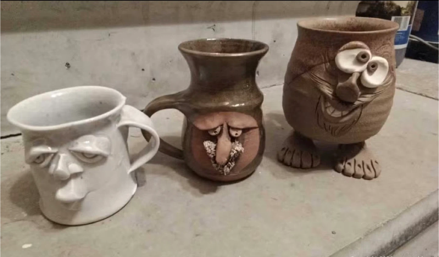Selling a set of unique, handmade ceramic mugs with quirky face designs. These mugs are perfect for adding a touch of personality to your morning coffee or tea. They're in great condition and ready to bring some fun to your kitchen!