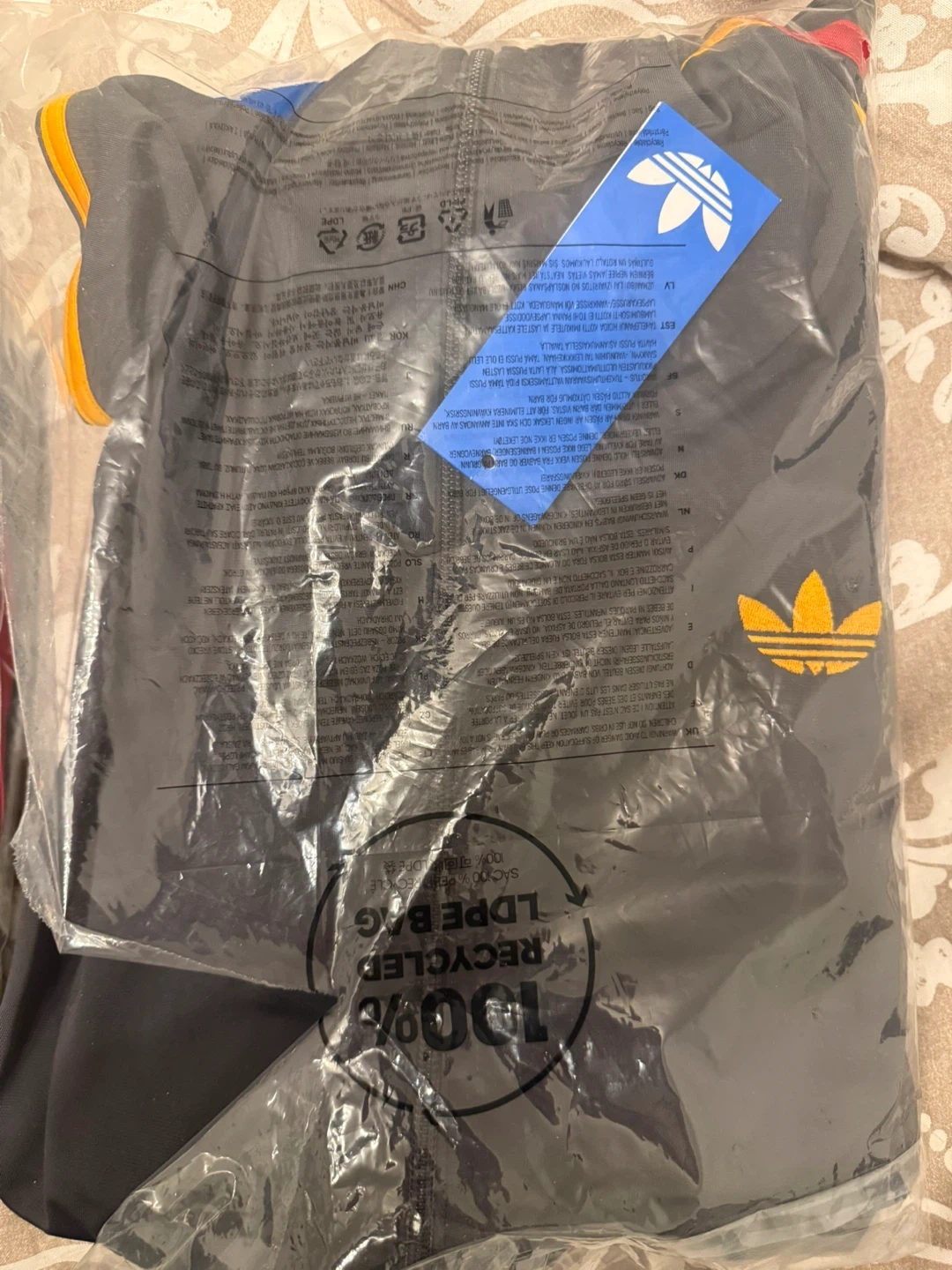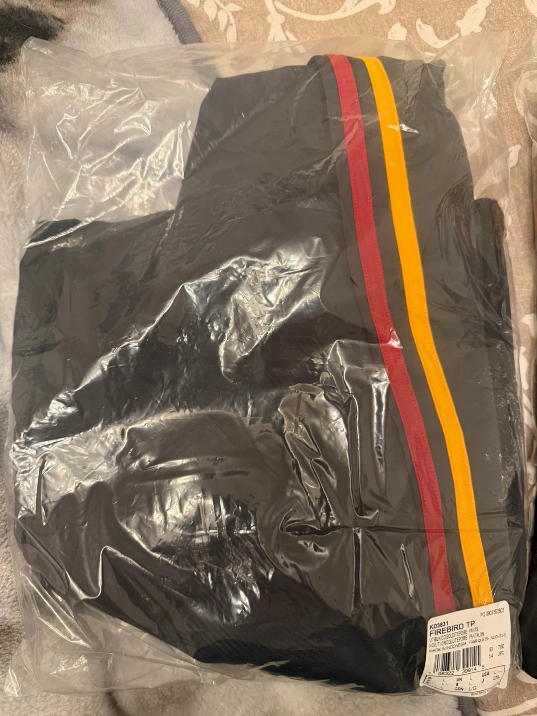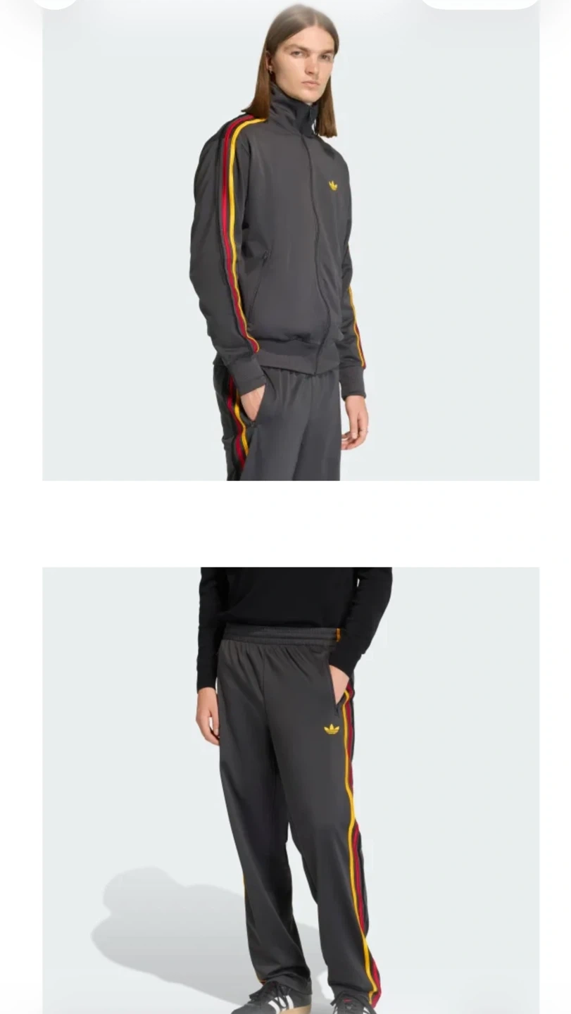 Classic Adidas Firebird track jacket in dark grey with red and yellow stripes. It's brand new, still in its original packaging with tags attached. Great for casual wear or athletic activities! World Cup exclusive!