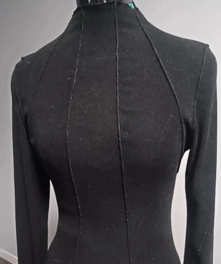 This black top features a ribbed texture and a mock neck design. It has long sleeves with a flattering fitted silhouette. It's made from a comfortable stretch fabric.