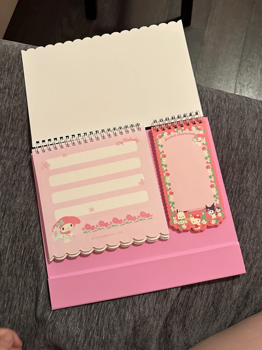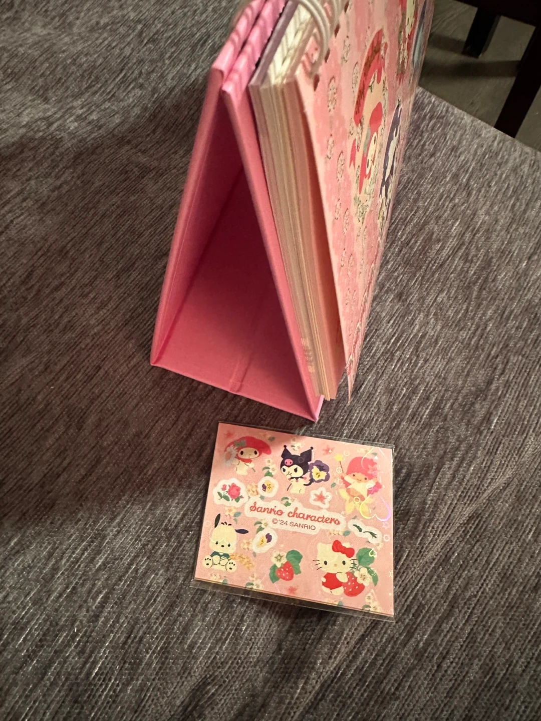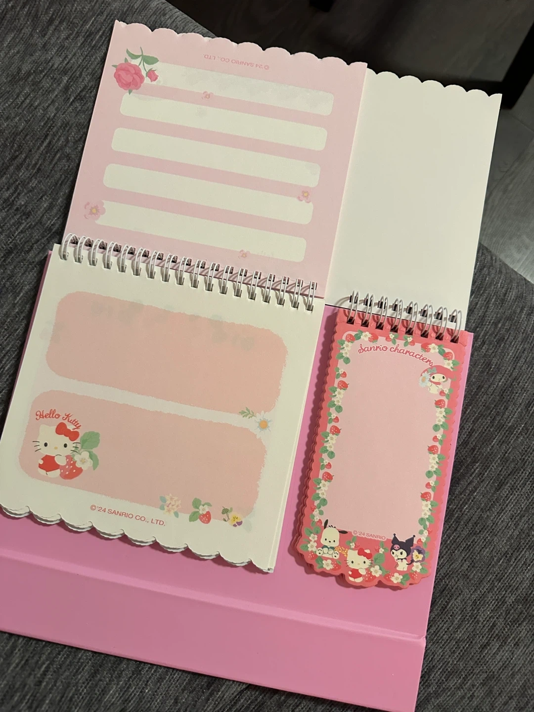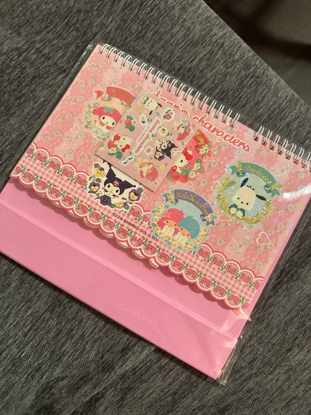 This cute pink spiral notebook features various Sanrio characters and comes with a sheet of matching stickers. It's perfect for jotting down notes or decorating your belongings. The set includes a small notepad and a larger spiral-bound notebook with decorative pages.