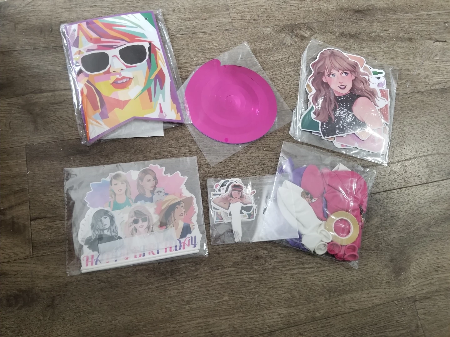 This set includes various Taylor Swift themed decorations for a birthday party. It contains cake toppers, banners, and balloons. Decorations feature colourful images of Taylor Swift. Brand new