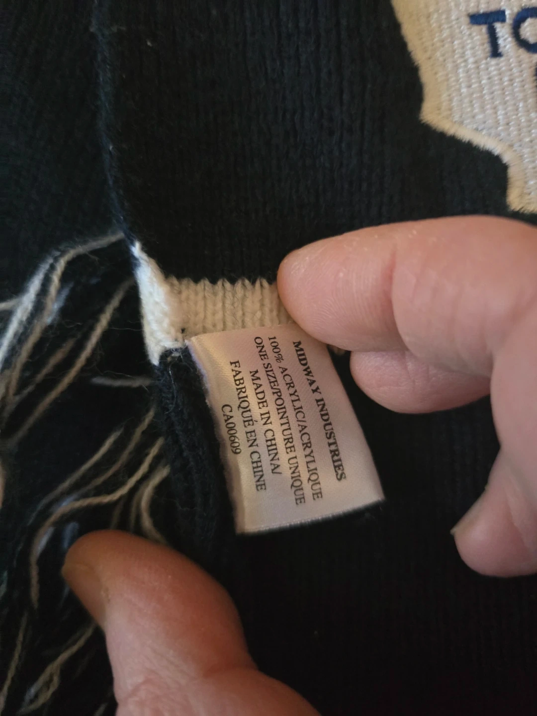 This Toronto Maple Leafs scarf is made of 100% acrylic. It's a one-size fits all accessory. Show your team spirit!
