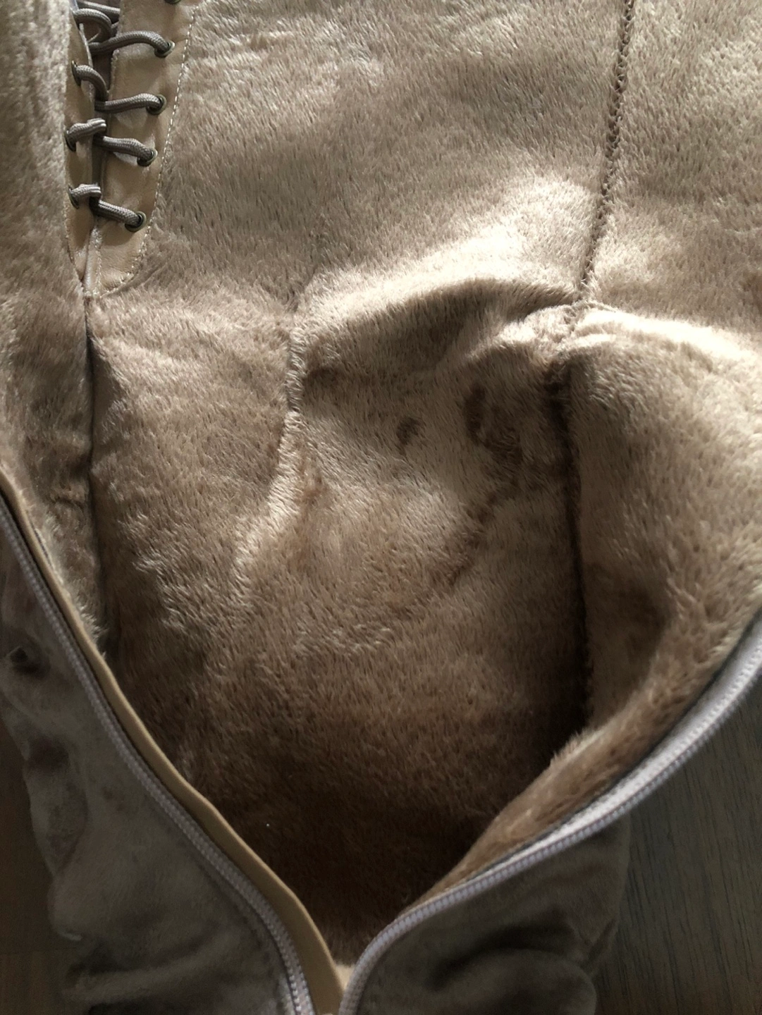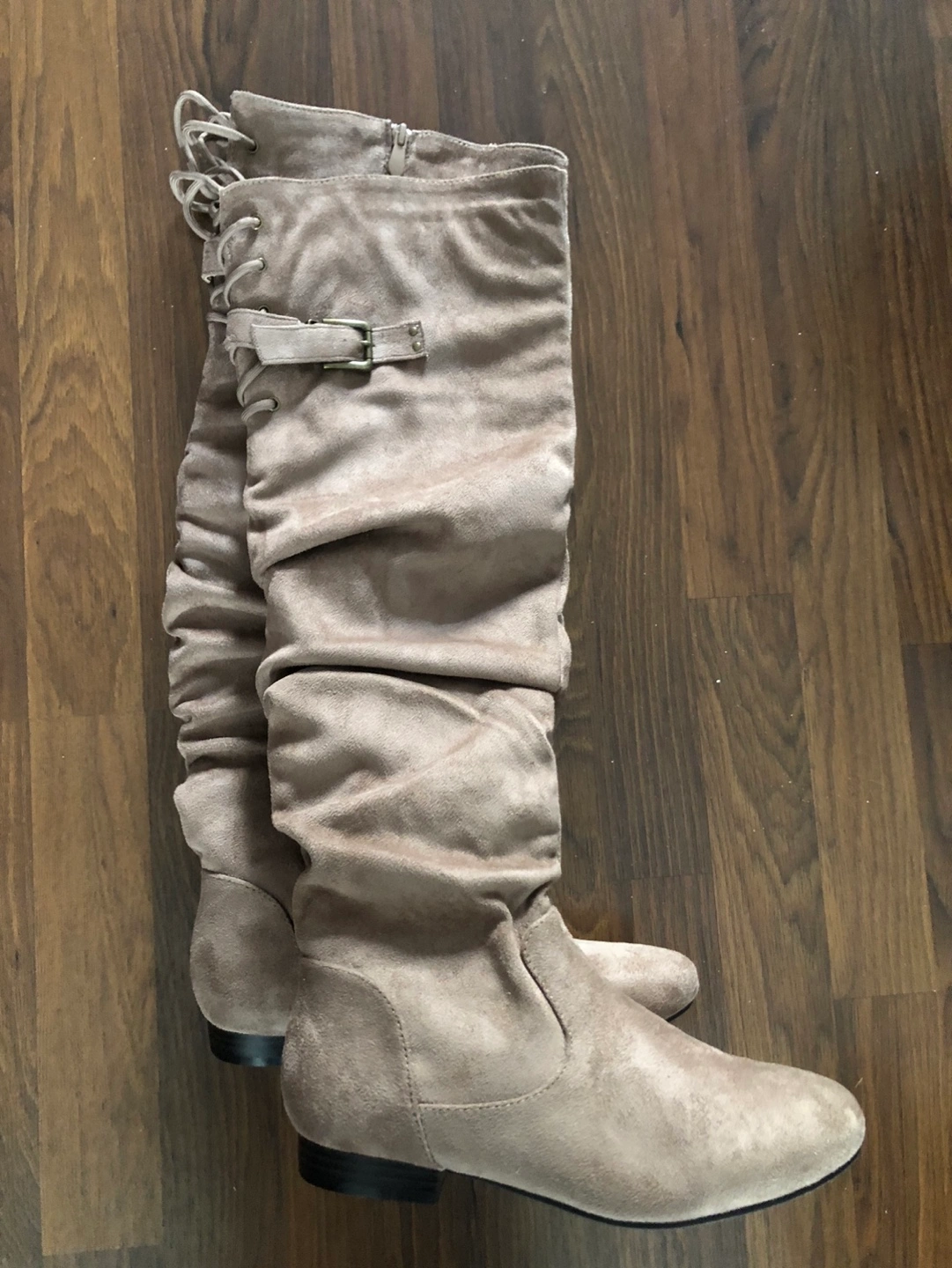Women's knee-high boots. Neutral beige suede. Lace-up detail at back. Size 7.5.
