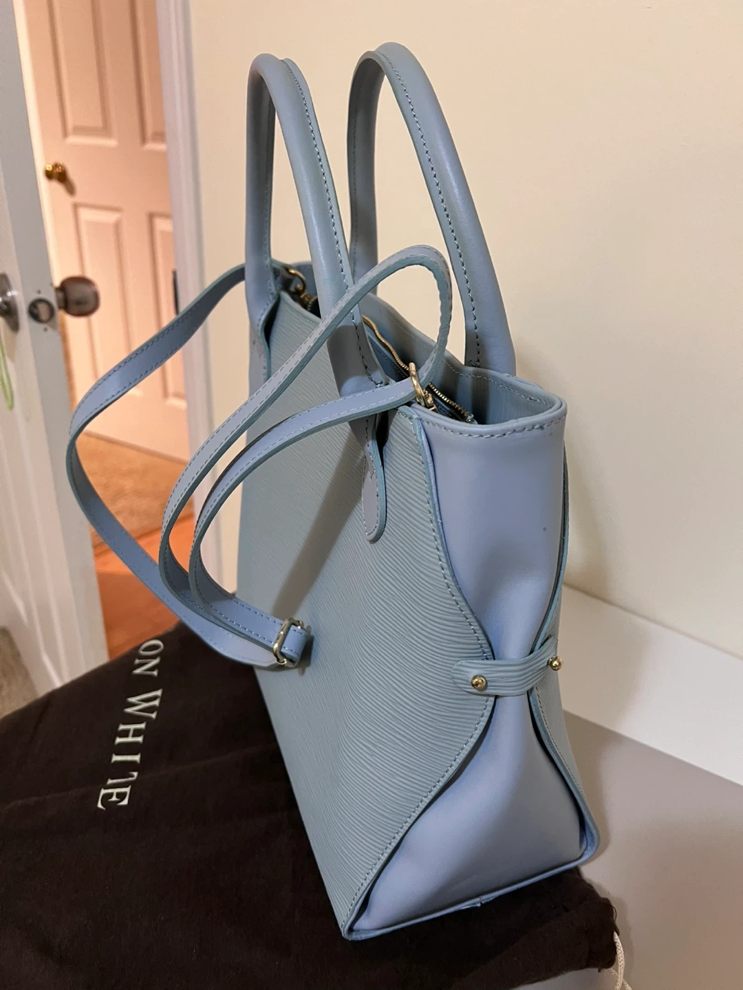 Light blue leather handbag by Ron White. It features a textured finish and a detachable shoulder strap. Includes dust bag.