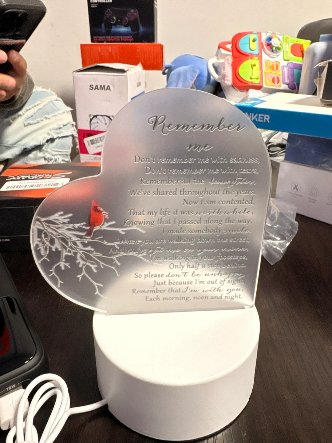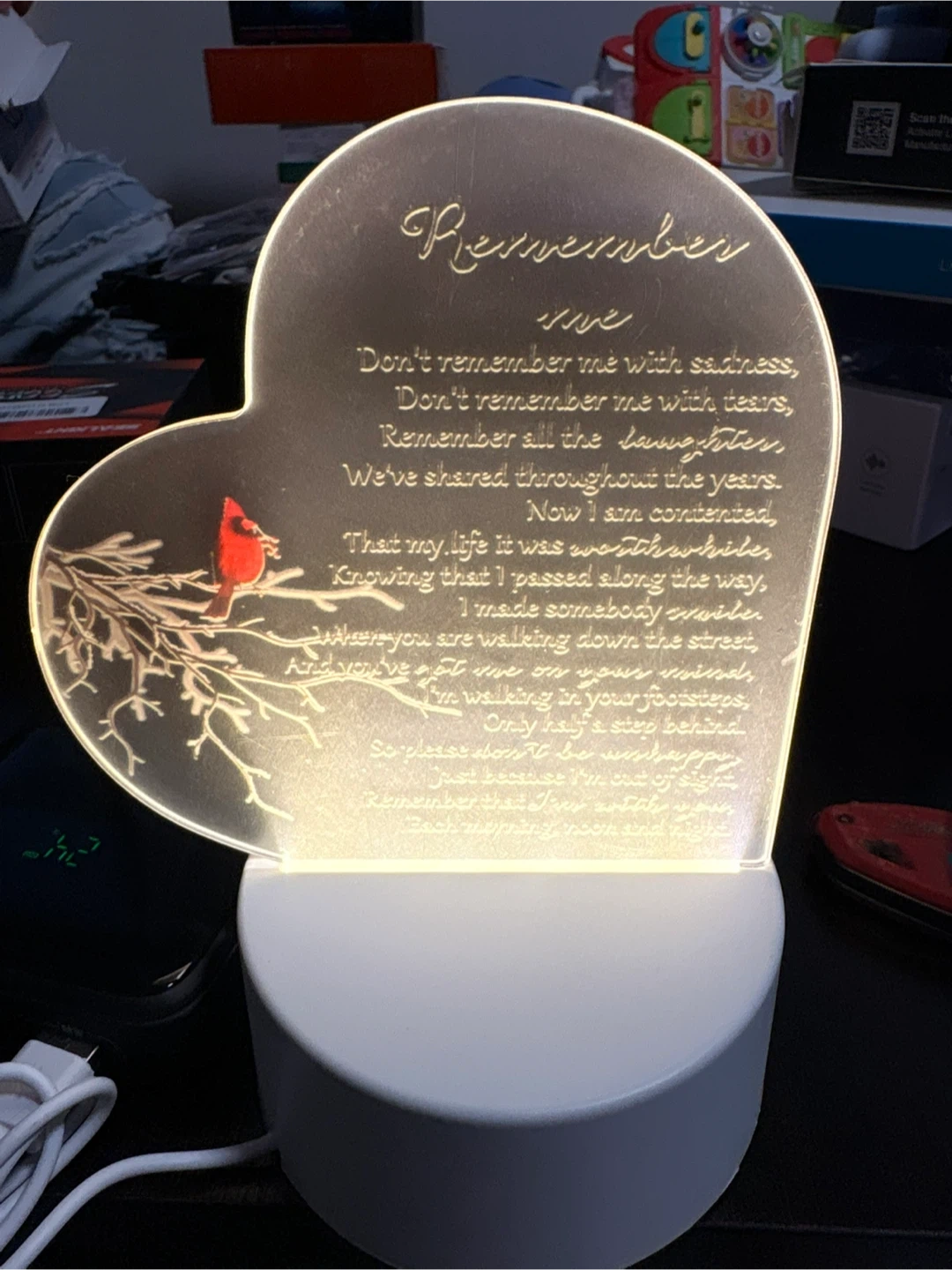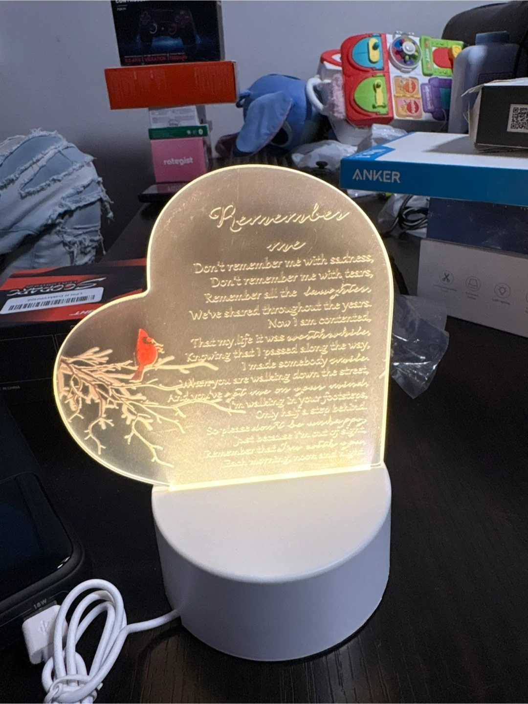 This heart-shaped memorial light features a poignant poem etched into its surface, accompanied by a delicate cardinal on a branch design. It's perfect for remembering a loved one. The light emits a soft glow from its white base.