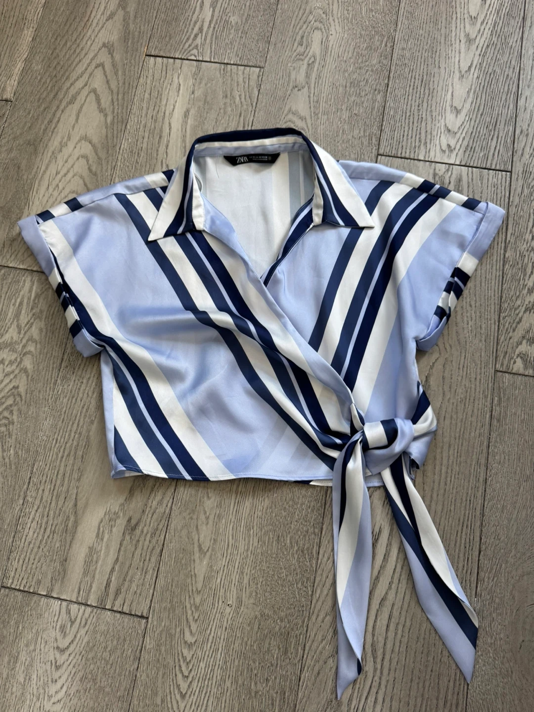 A blue and white striped top from Zara. It features a tie closure at the side and short sleeves. This silky top is great for dressing up or down!