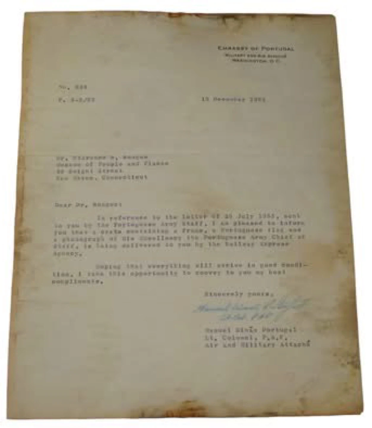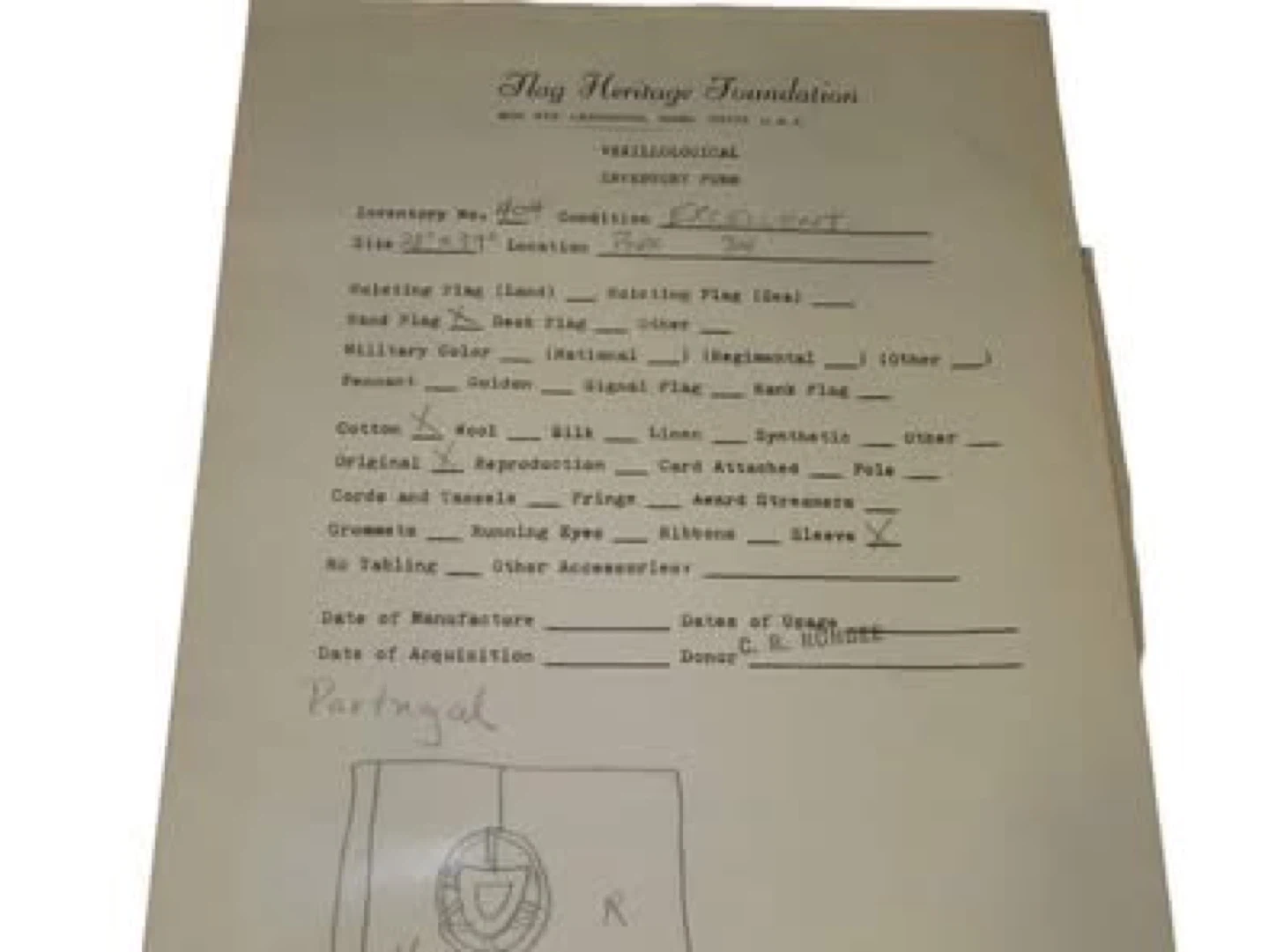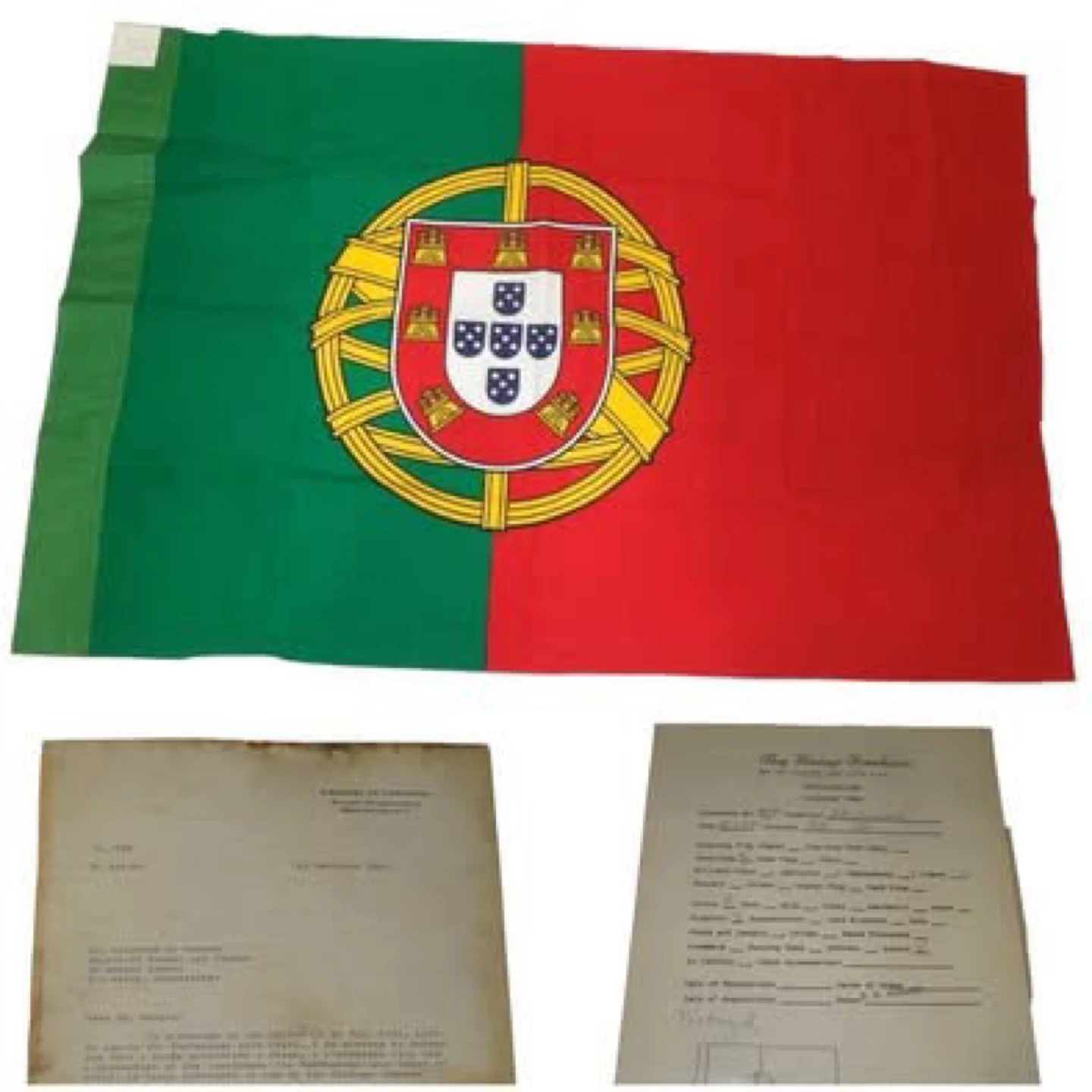 Original Portugal Military flag in excellent condition with provenance documents from The Embassy of Portugal dated 1955. Signed by Manuel Simao Lt. Colonel PAF addressed too : WW1 Veteran Dr. Clarence Rungee collection - Museum of people & places in New Haven Connecticut U.S.A. Flag was acquired from his museum collection.