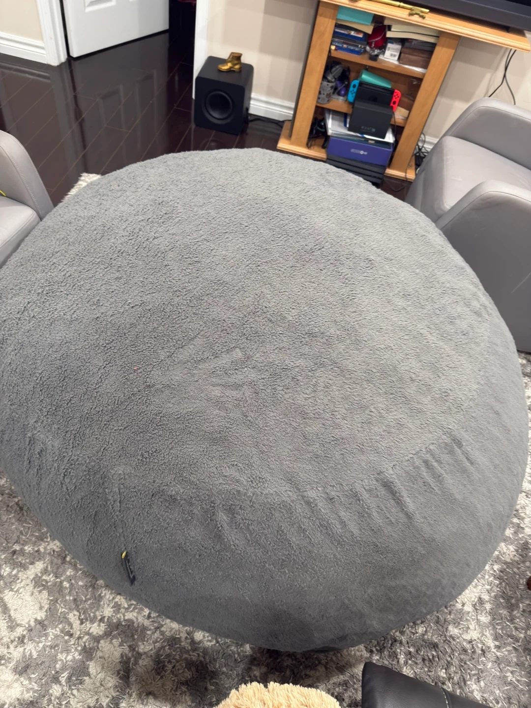 Comfortable, large bean bag chair in a soft grey fabric. Its round shape and plush texture make it a cozy spot for lounging. This chair is perfect for a family room or casual living space.