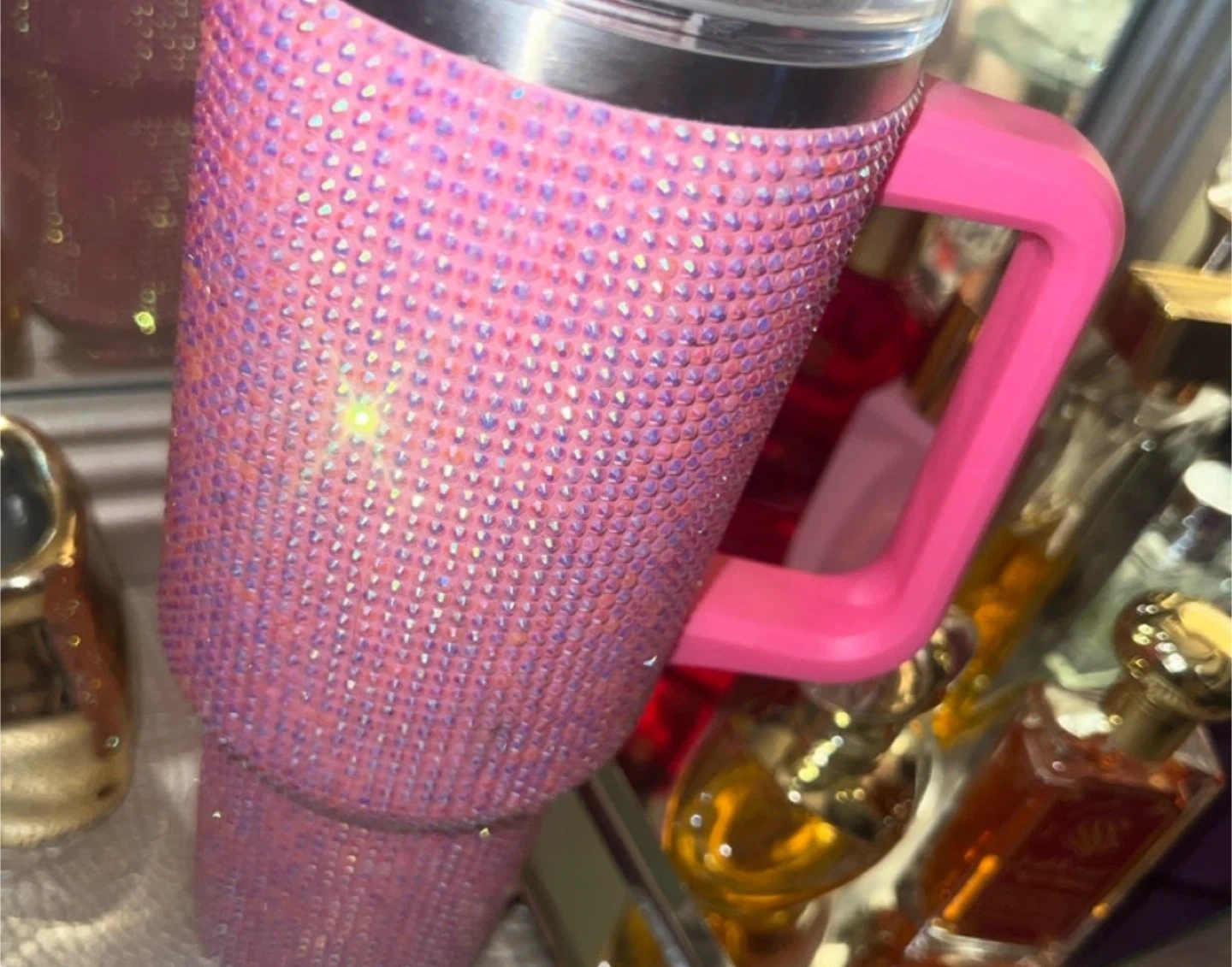 Sparkly pink tumbler covered in rhinestones and featuring a bright pink handle. It includes a clear lid and a pink straw. This insulated mug is perfect for keeping your drinks hot or cold all day!