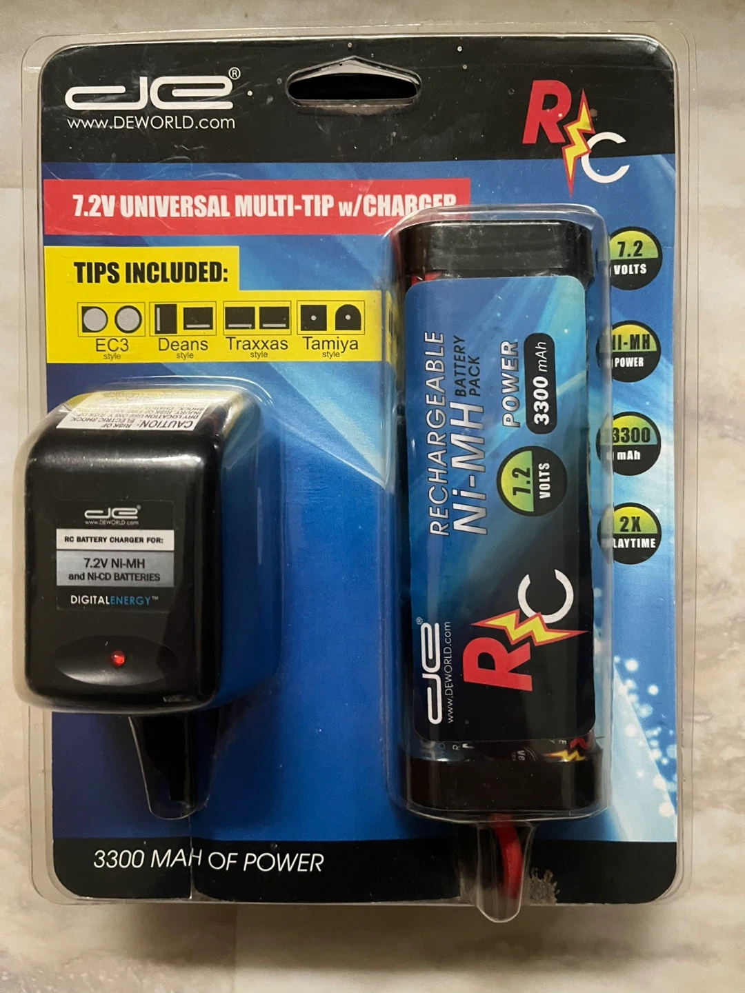 60Selling a DEWORLD 7.2V universal multi-tip charger with a rechargeable Ni-MH battery pack. It includes tips for EC3, Deans, Traxxas, and Tamiya styles. The battery pack has 3300 mAh of power and offers 2x playtime.