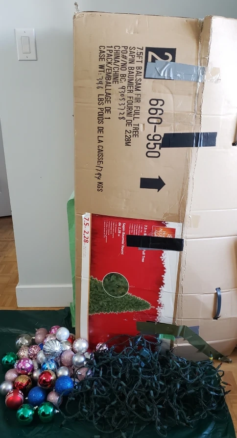 53Selling a 7.5ft Balsam Fir full tree. It's been used but still in great shape! Comes with the box and all the ornaments and lights you see in the pictures.