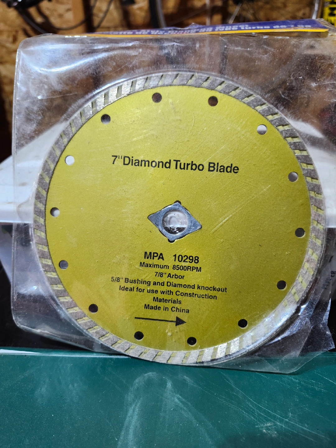Selling a 7" Diamond Turbo Blade. It's an MPA 10298 model. - Maximum 8500RPM - 7/8" Arbor - 5/8" Bushing and Diamond knockout - Ideal for use with Construction Materials