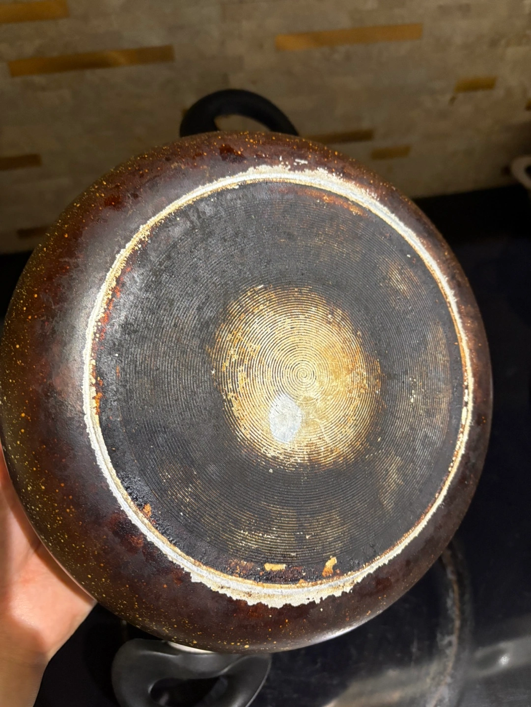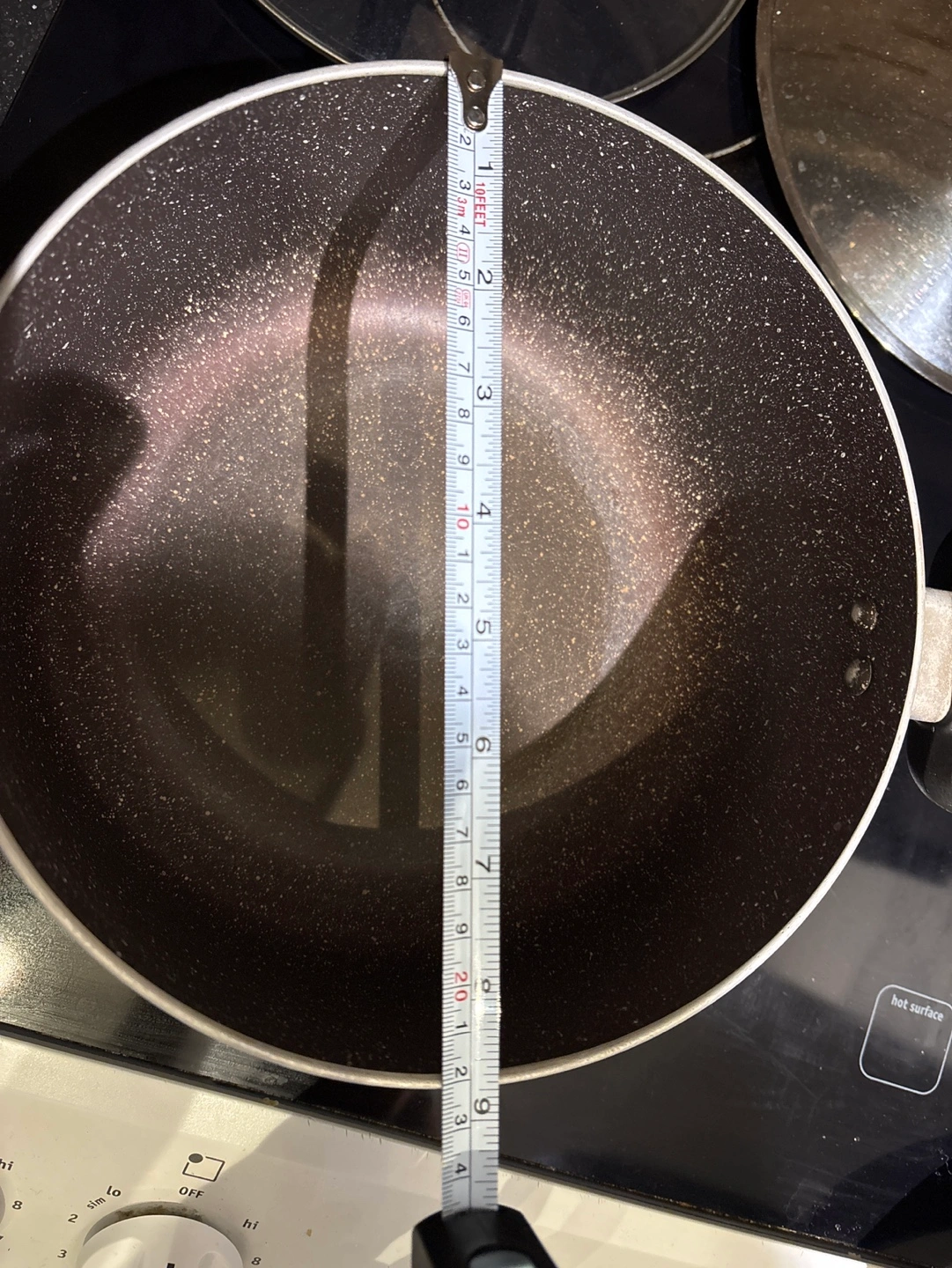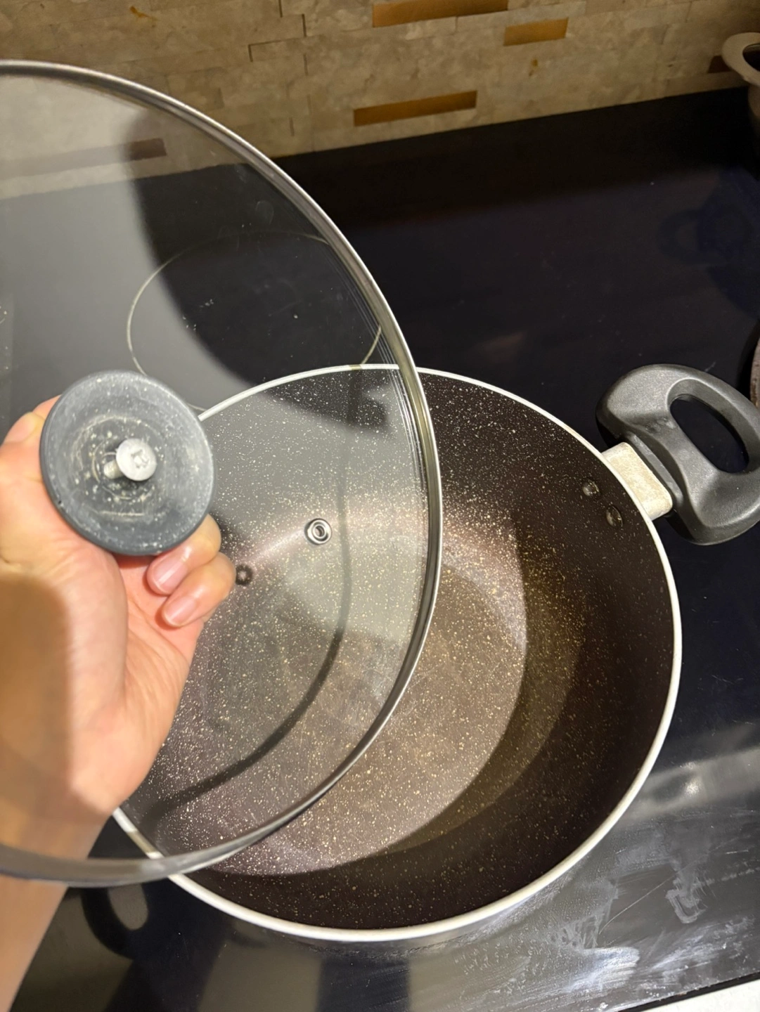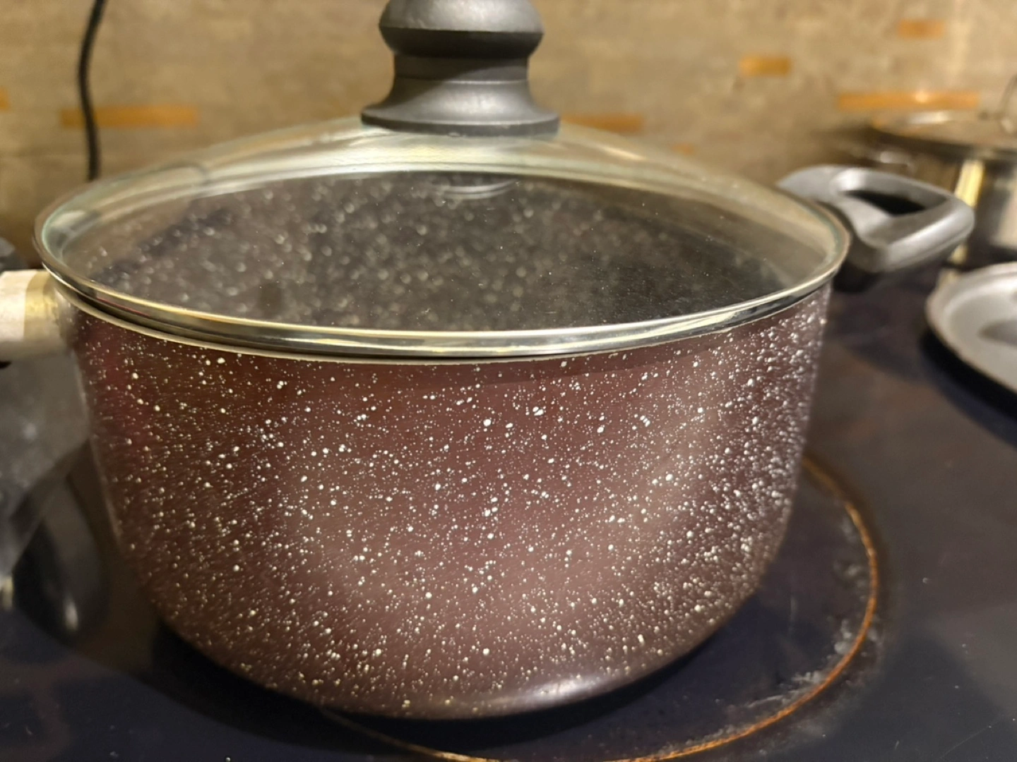 747 inch pot with a glass lid. Black with speckles.