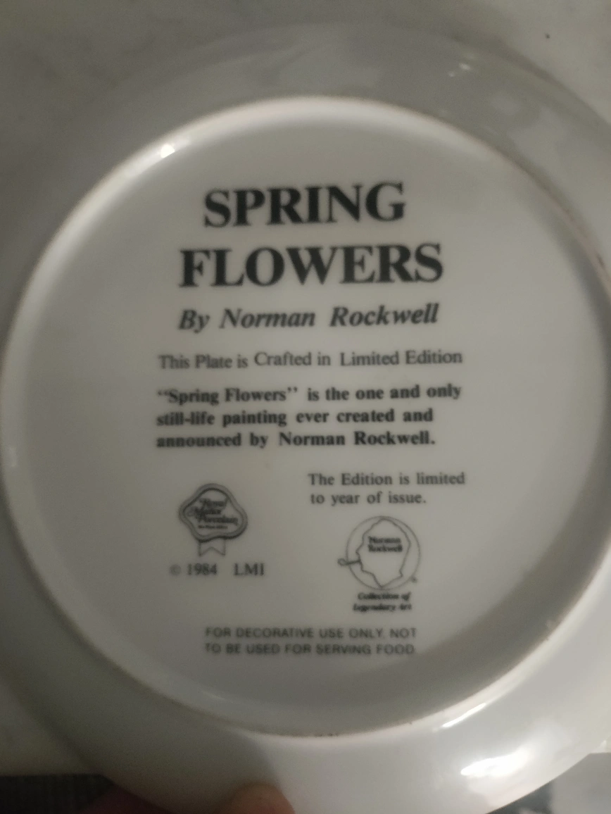 Selling a Norman Rockwell collector's plate titled "Spring Flowers"! This plate is crafted in limited edition and is the only still-life painting ever created and announced by Norman Rockwell. The edition is limited to the year of issue, 1984 LMI. For decorative use only, not to be used for serving food