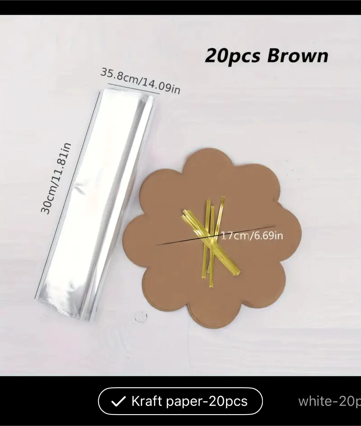 Selling 20 pieces of brown kraft paper. The dimensions are 30cm/11.81in x 35.8cm/14.09in. The flower shaped kraft paper is 17cm/6.69in 20pcs Clear Disposable Plastic Cake Bags - Perfect for Bakery Delivery & Home Baking, Ideal for Chiffon, Toast, Cookies & Pastries