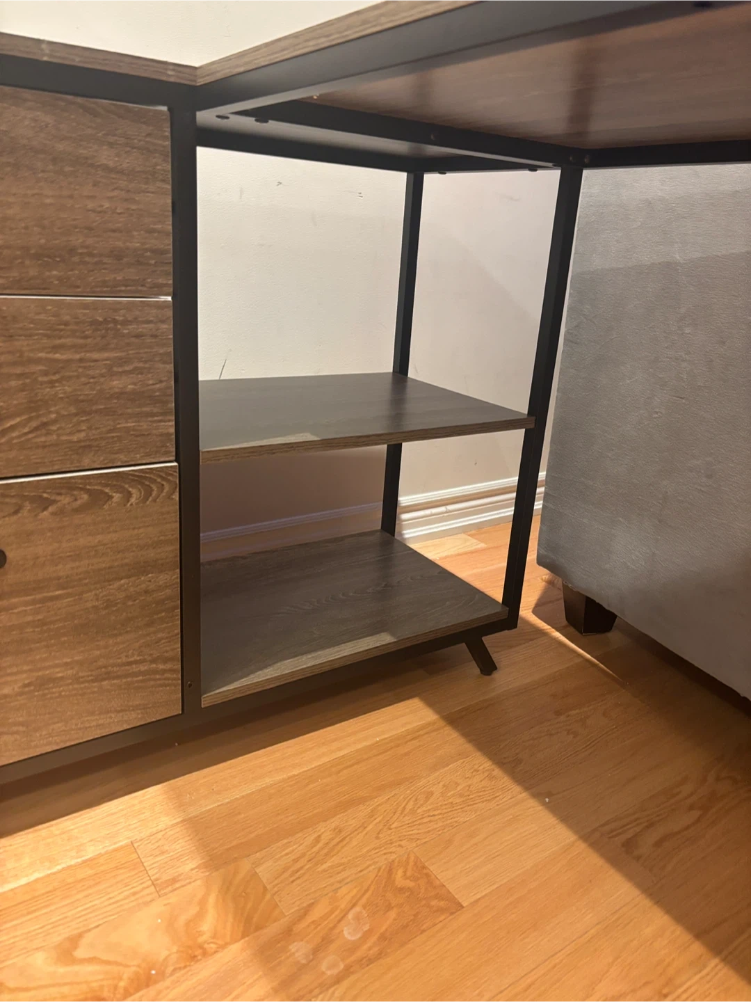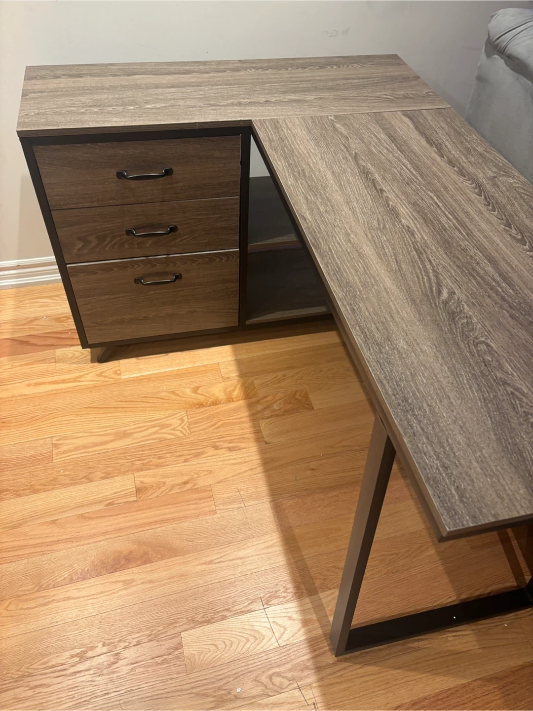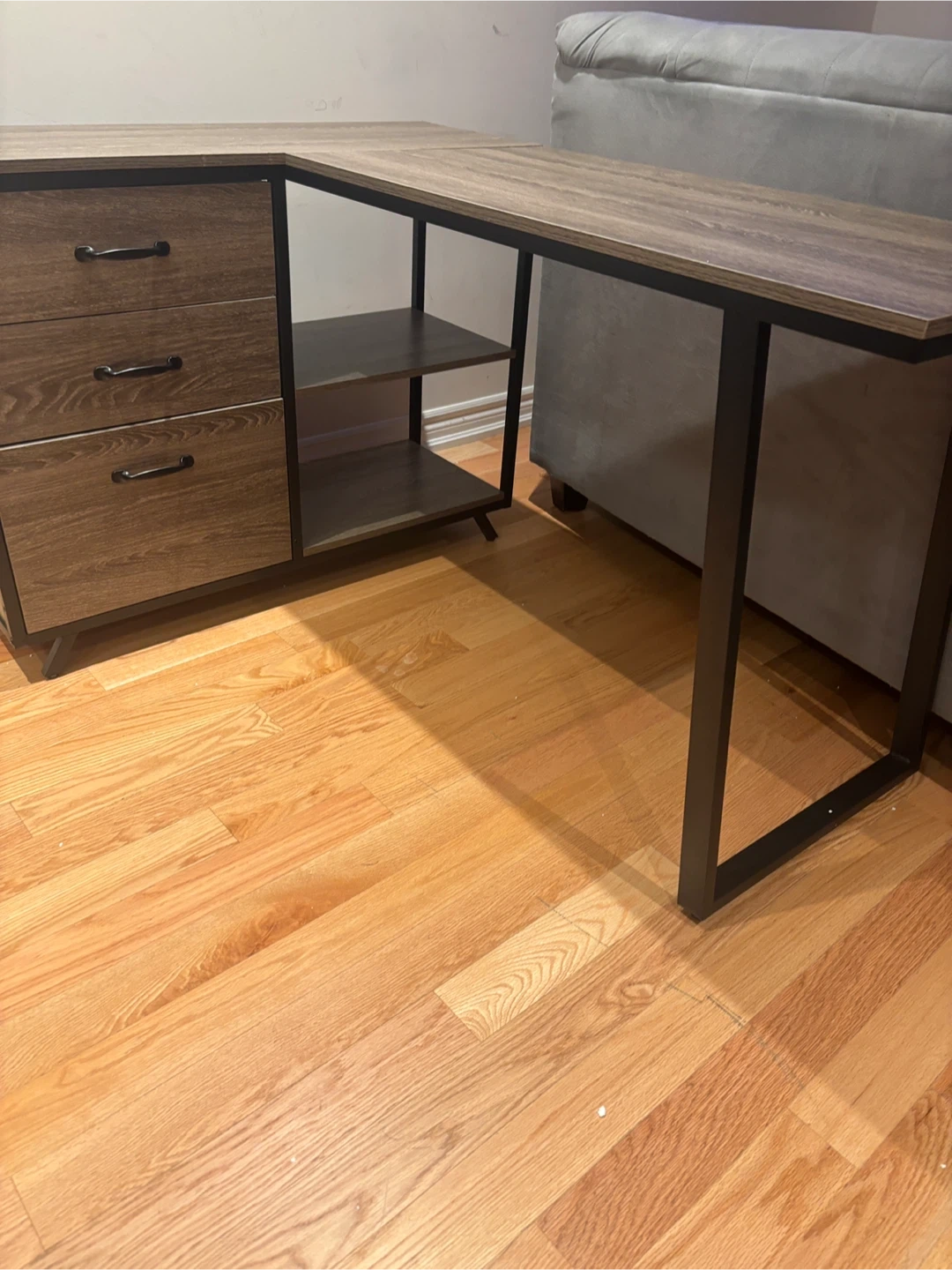 202Selling a stylish computer L-shaped desk with a wood grain finish! It features a set of drawers on one side and open shelving on the other, perfect for organizing your workspace. The desk has a modern look with a dark metal frame. Great for a home office or study area!. Available for pickup and delivery