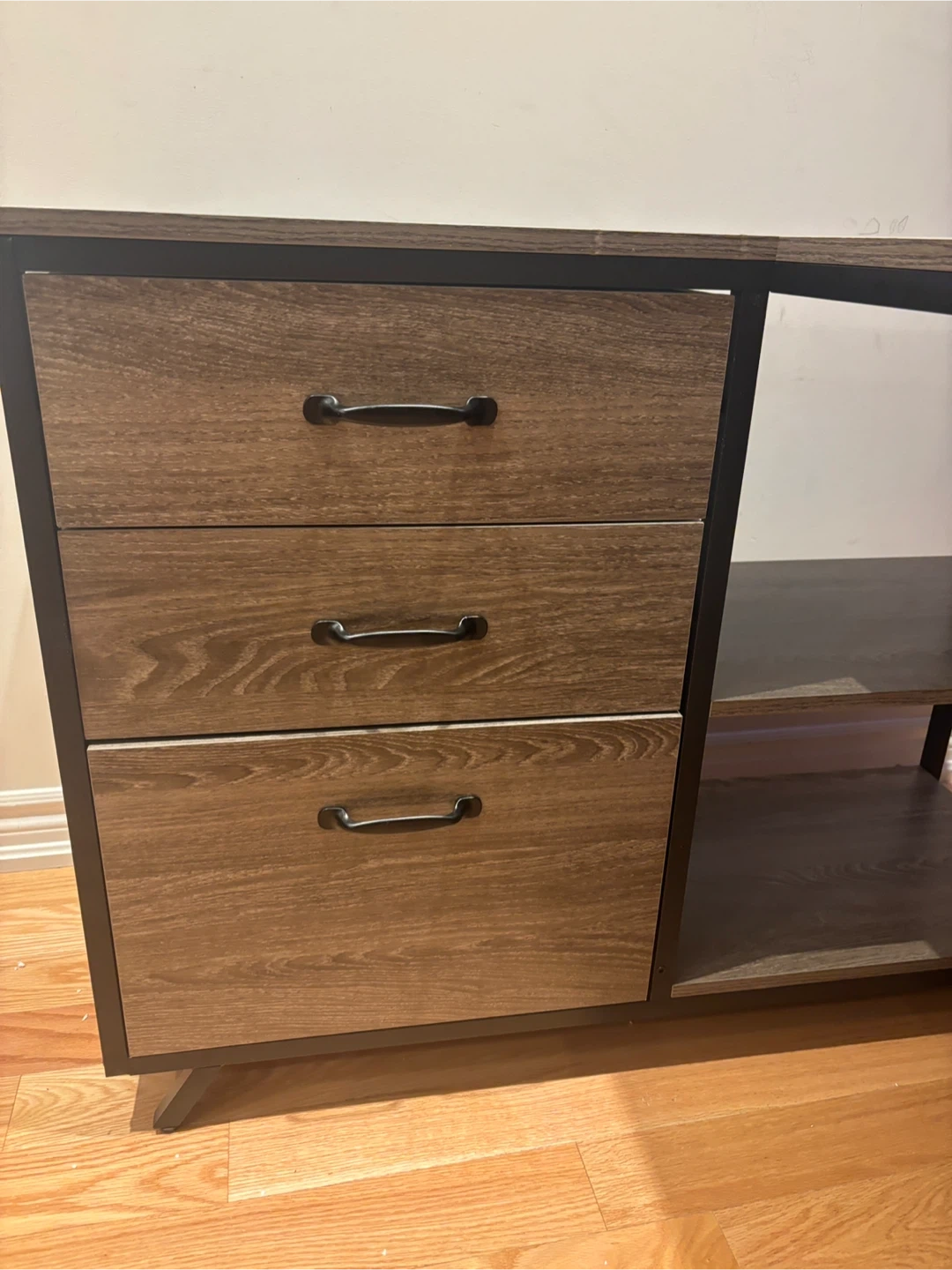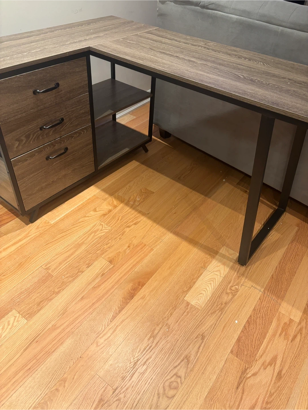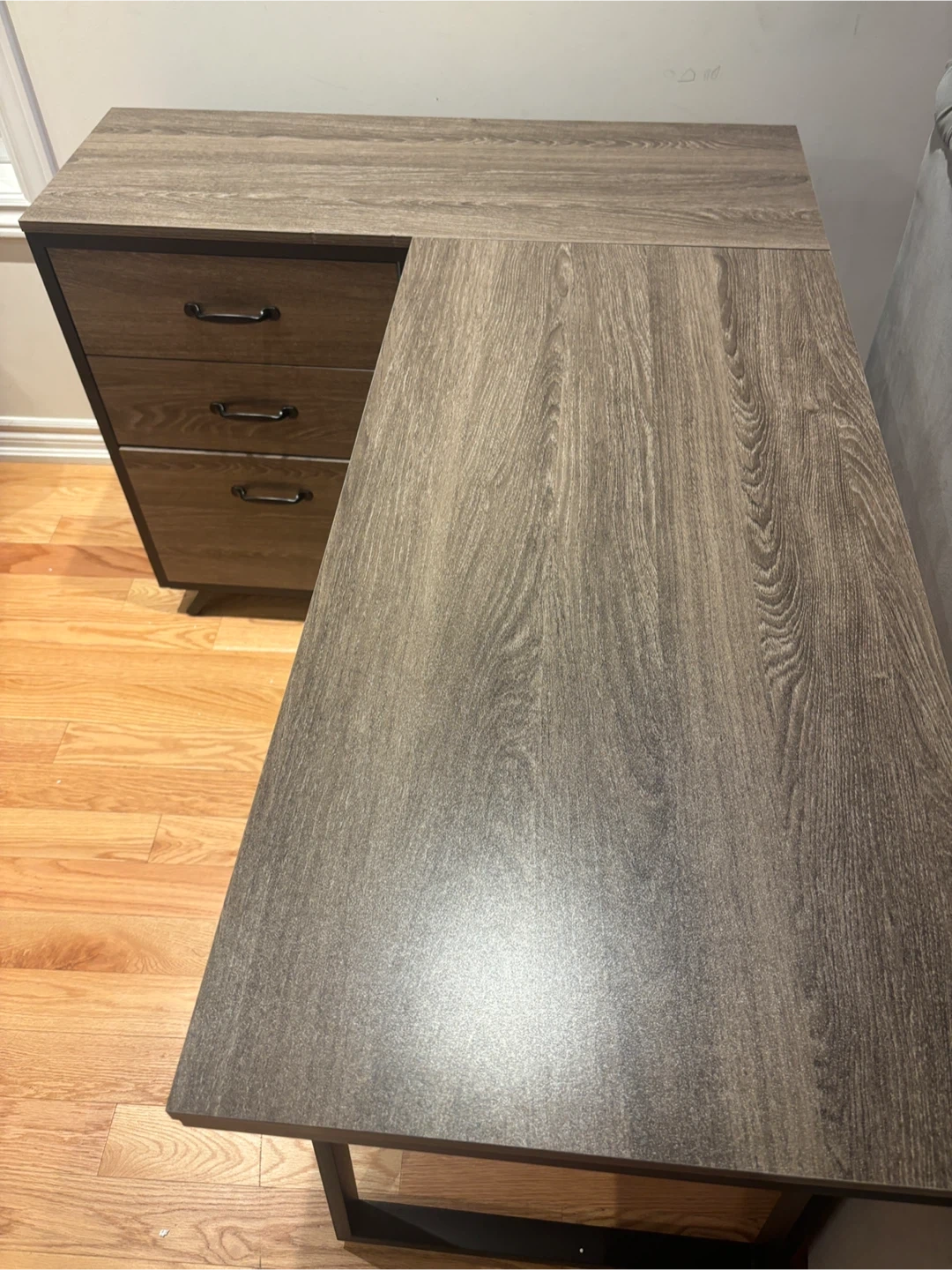 202Selling a stylish computer L-shaped desk with a wood grain finish! It features a set of drawers on one side and open shelving on the other, perfect for organizing your workspace. The desk has a modern look with a dark metal frame. Great for a home office or study area!. Available for pickup and delivery