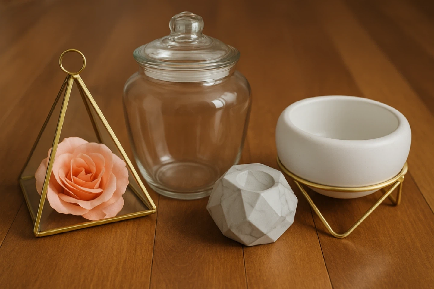 88Selling a set of decorative items! Includes a glass jar with a lid, 2 geometric terrarium , a geometric candle holder, and a white small succulent planter with a gold stand. These would look great as a centrepiece or on a shelf