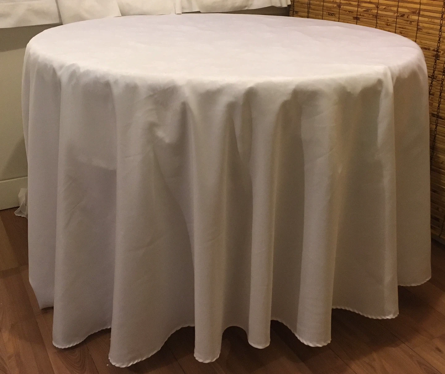 10Selling a white round tablecloth, polyester fabric perfect for events like wedding/party/banquet, dinning. $25 each or 6 for $130. It measures approximately 120 inches in diameter. It's in great condition,