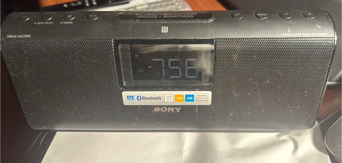 Selling a Sony ICF-CS20BT Dream Machine clock radio. It has Bluetooth, FM/AM radio, and a mega bass speaker. Perfect for your bedside table!