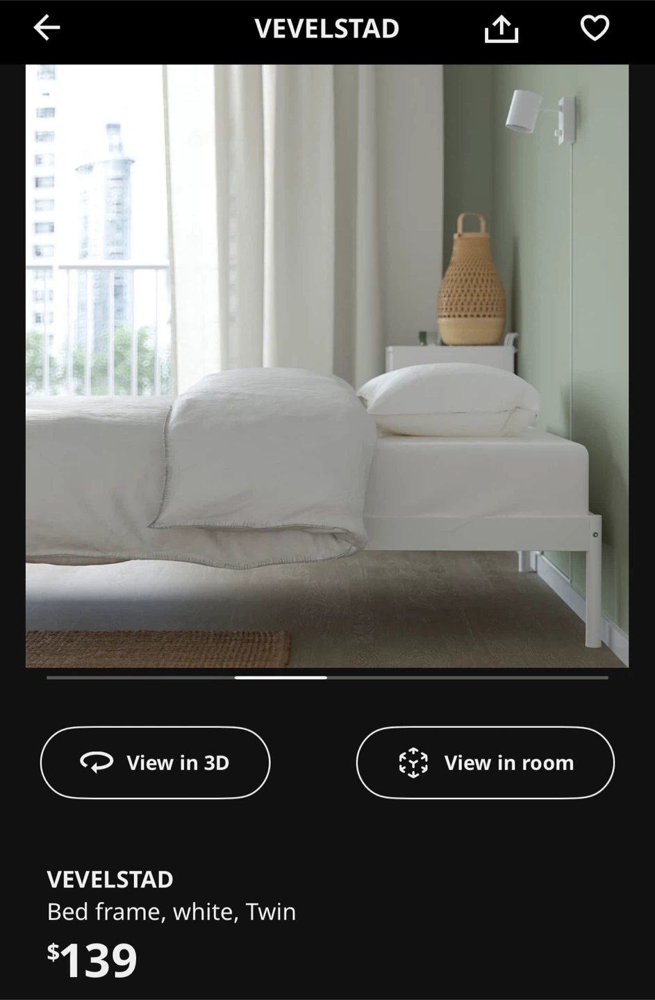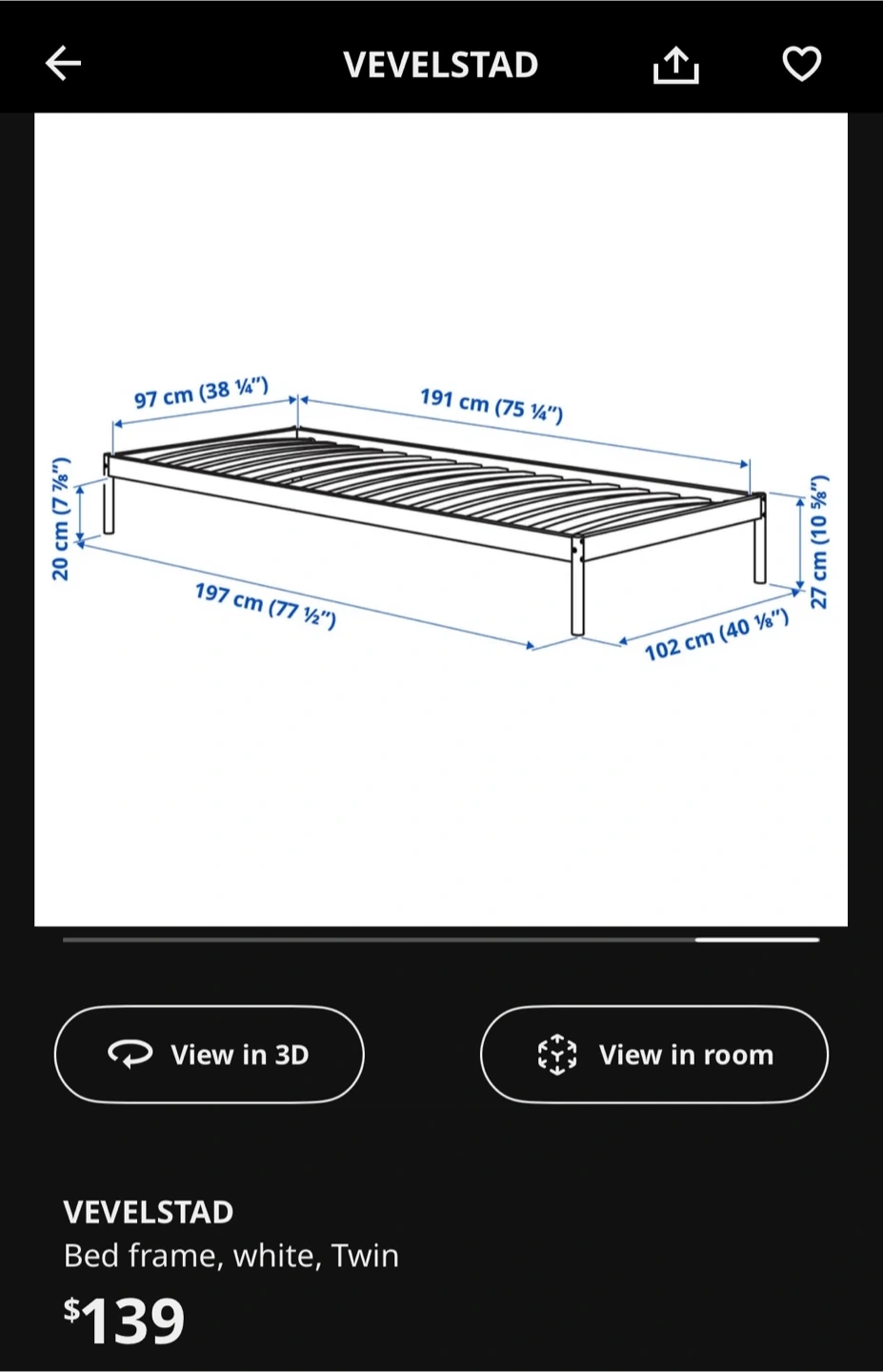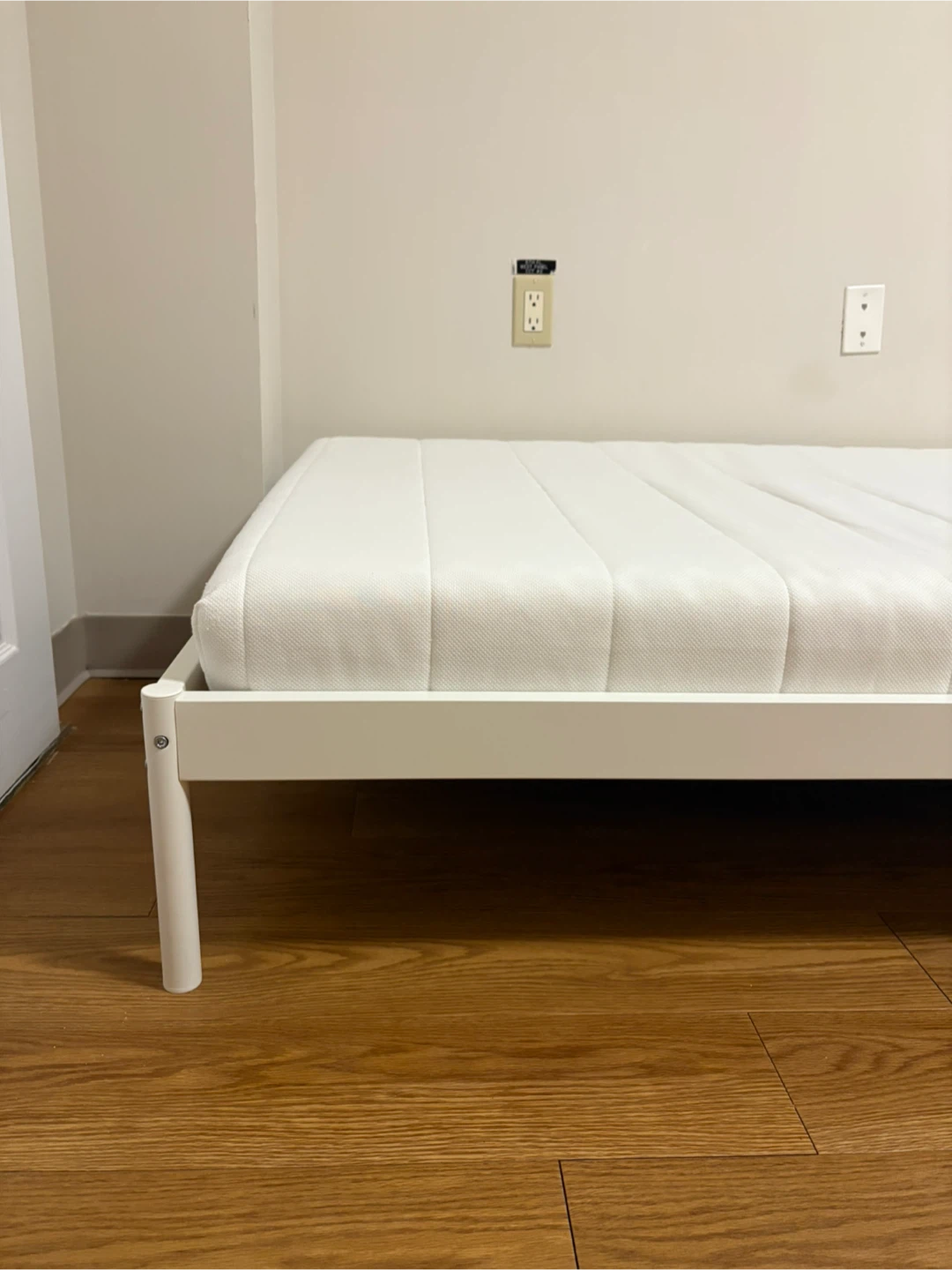 Selling a bed frame in perfect condition! It's a simple and sturdy white metal frame from IKEA - VEVELSTAD. Includes the wooden slats and I can throw in that ikea mattress for free, the outer fabric comes off for washing.