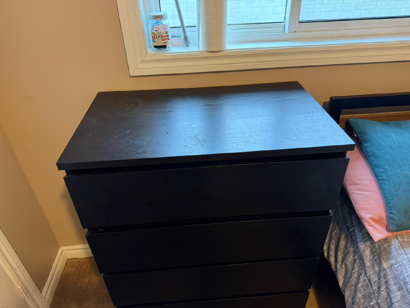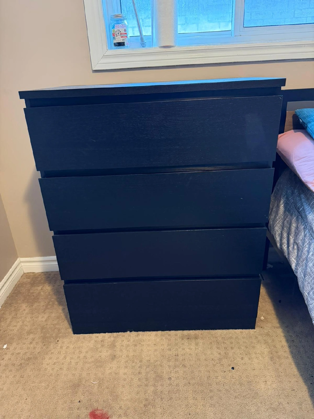 Selling a black IKEA Malm dresser with 4 drawers. It's in good condition and perfect for extra storage in a bedroom or closet. There are some signs of use on the top surface and a few marks around the bottom but other then that it's still got a lot of good use for it. Regular $169.99 in store.