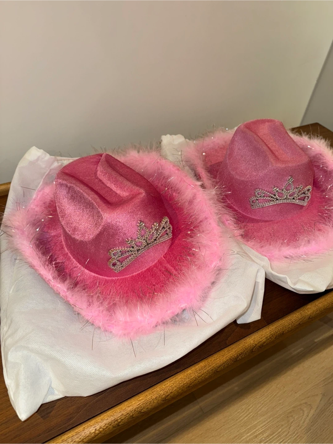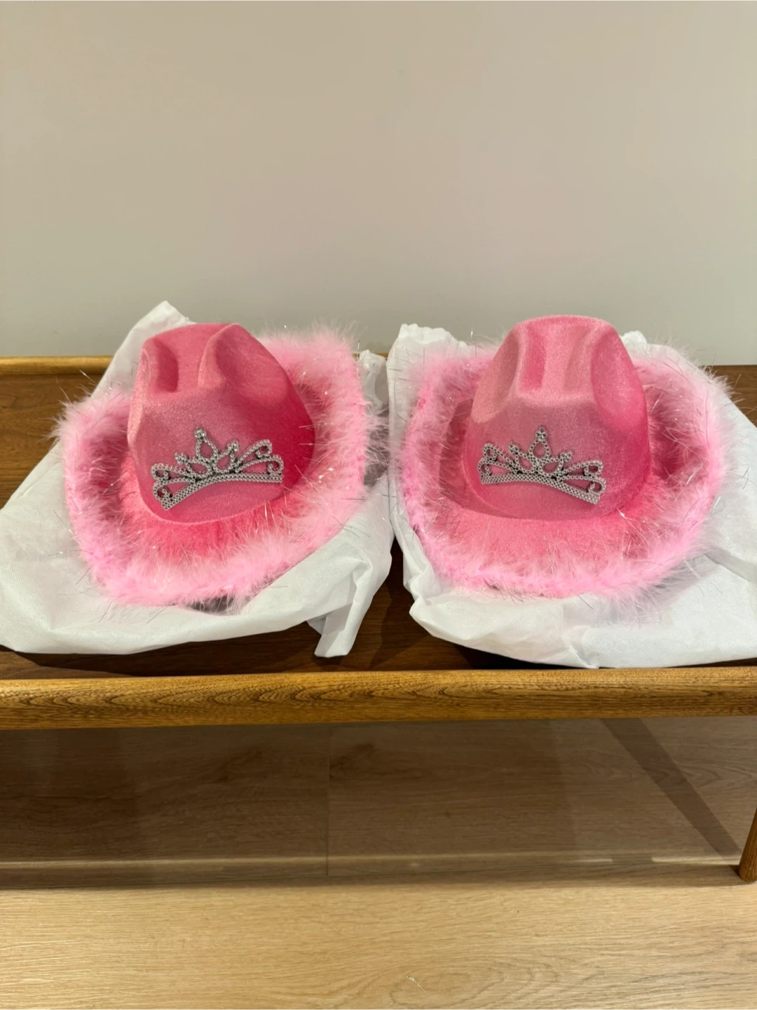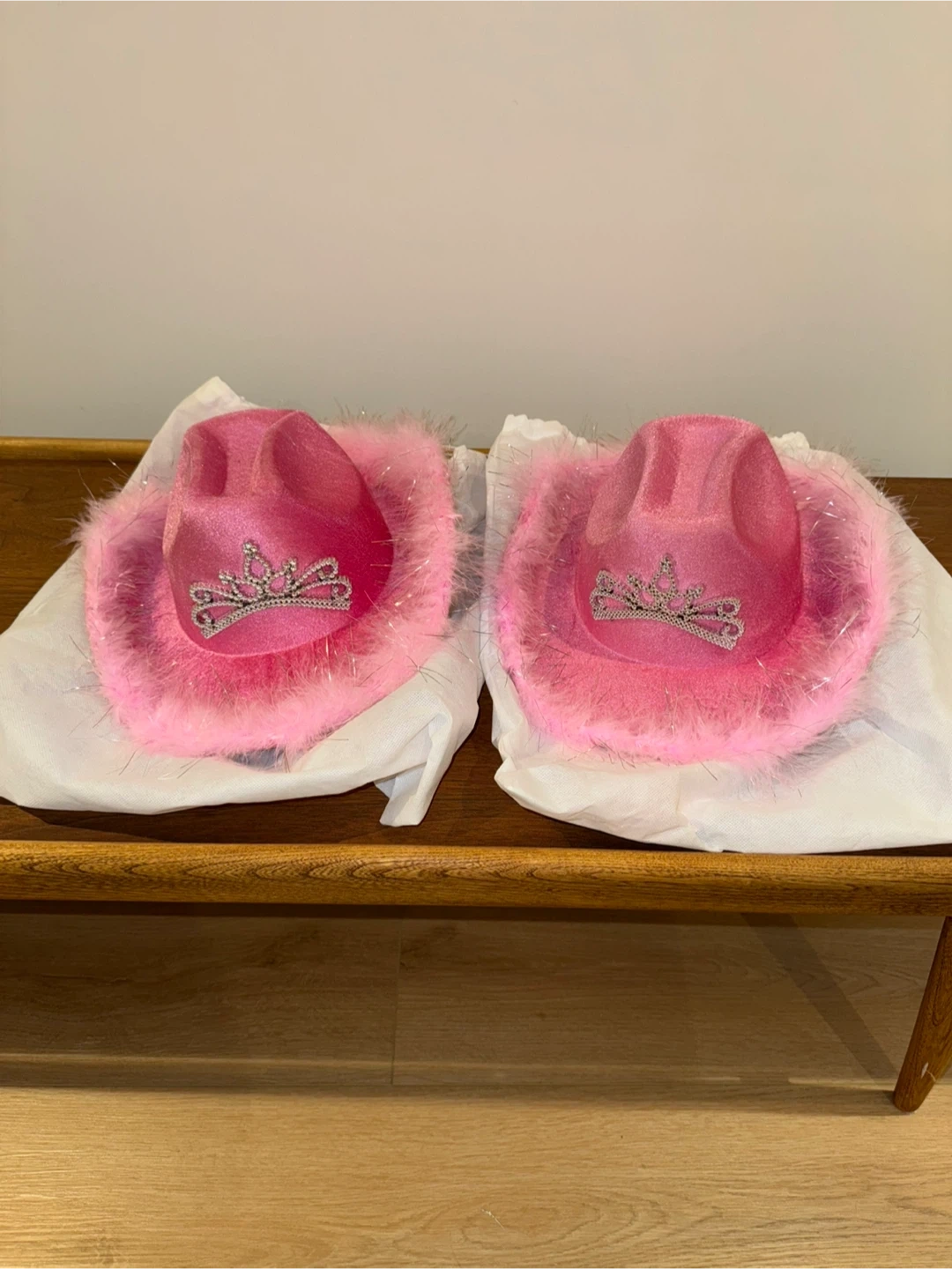 Selling two fun pink cowboy hats. It's got a cute little crown on the front and fluffy trim. Perfect for bachelorette/birthday parties or Halloween.