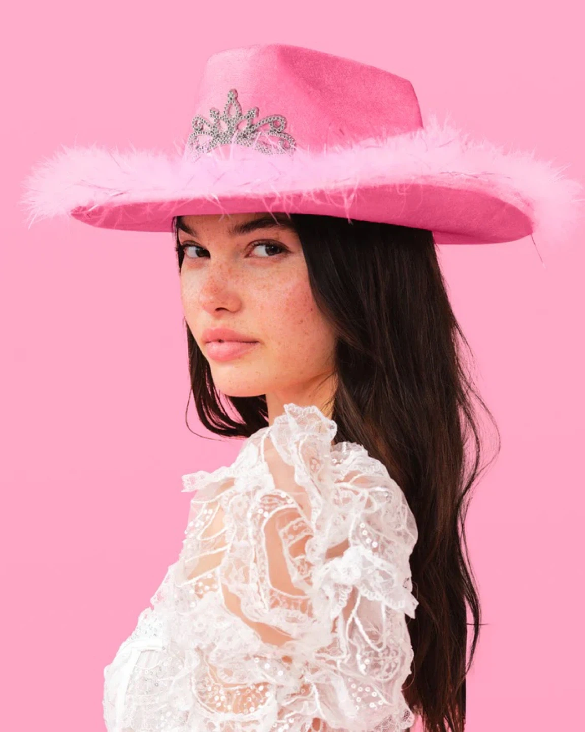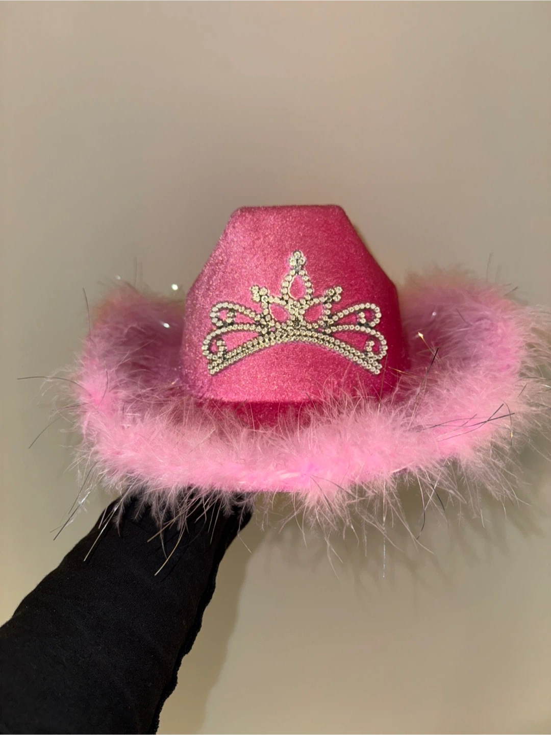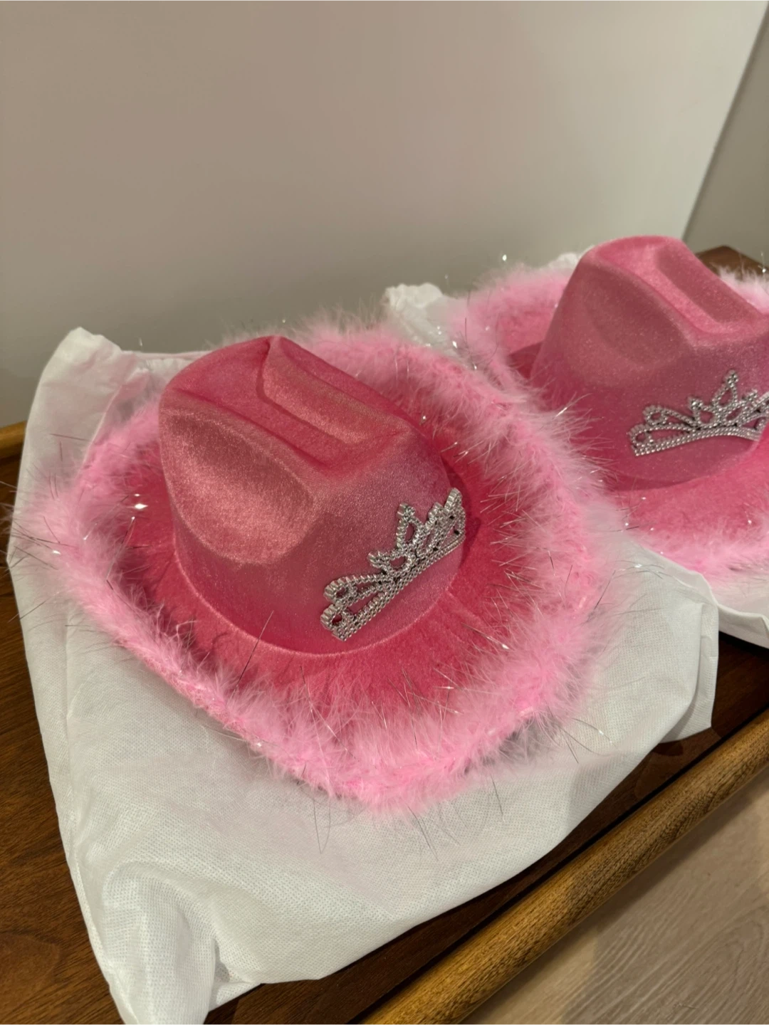 Selling two fun pink cowboy hats. It's got a cute little crown on the front and fluffy trim. Perfect for bachelorette/birthday parties or Halloween.