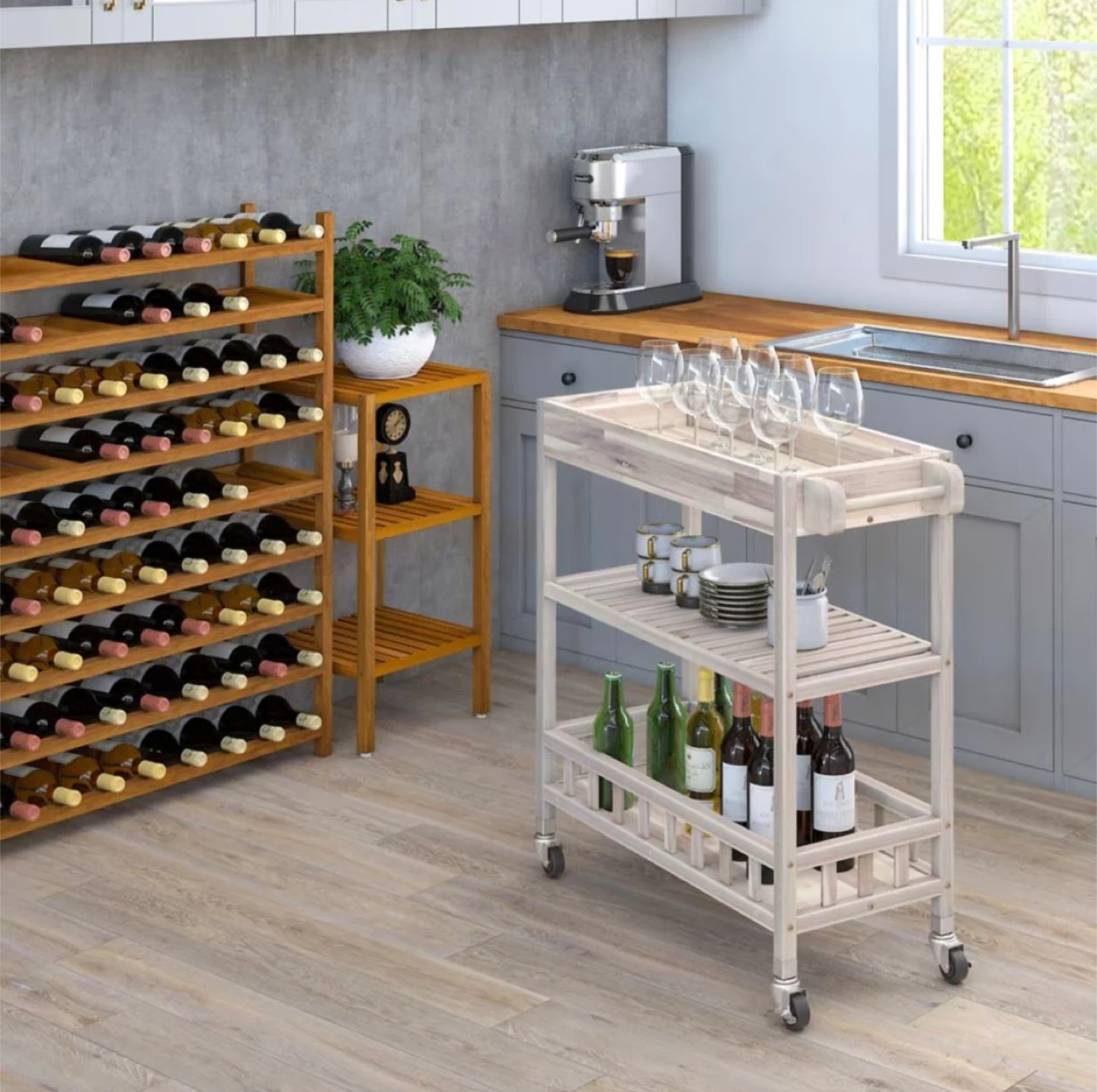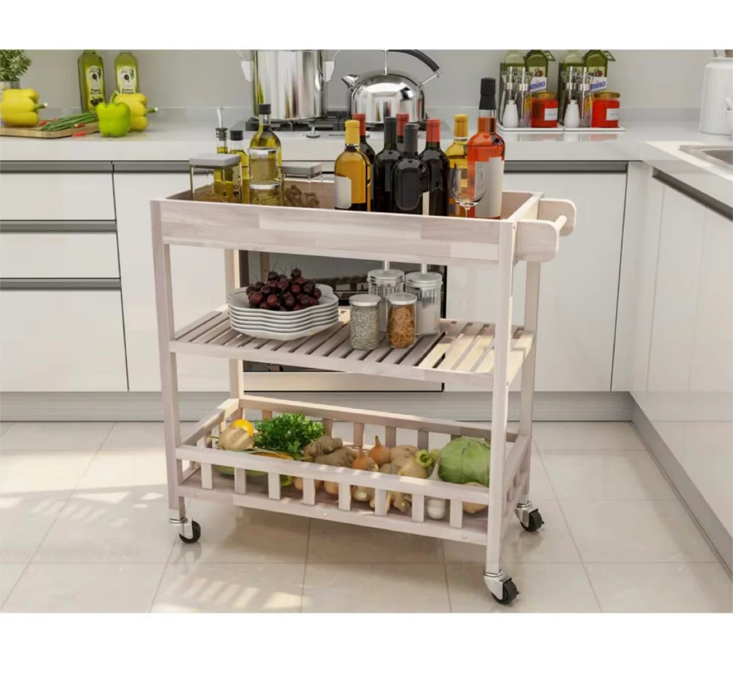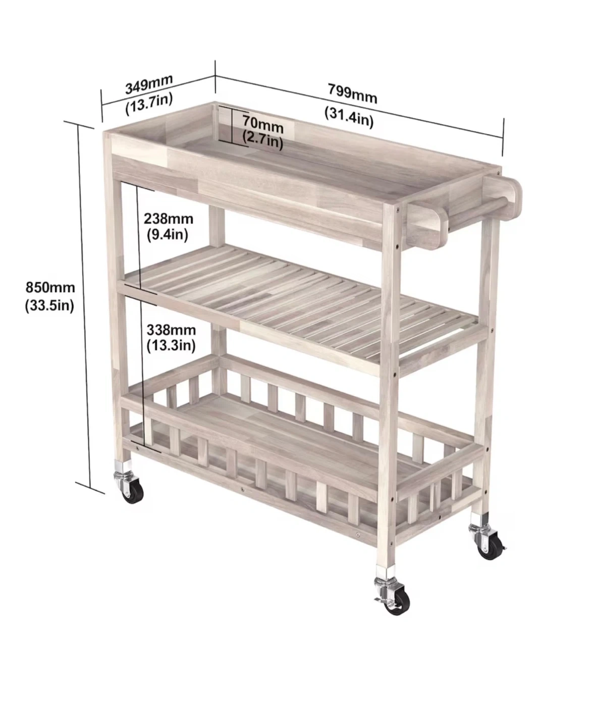 This rolling kitchen cart island is perfect for adding extra storage and workspace to your kitchen! It features a whitewashed wood finish and three tiers of shelving. The dimensions are approximately 850mm (33.5in) high, 799mm (31.4in) wide, and 349mm (13.7in) deep. Great for storing wine, dishes, or kitchen supplies
