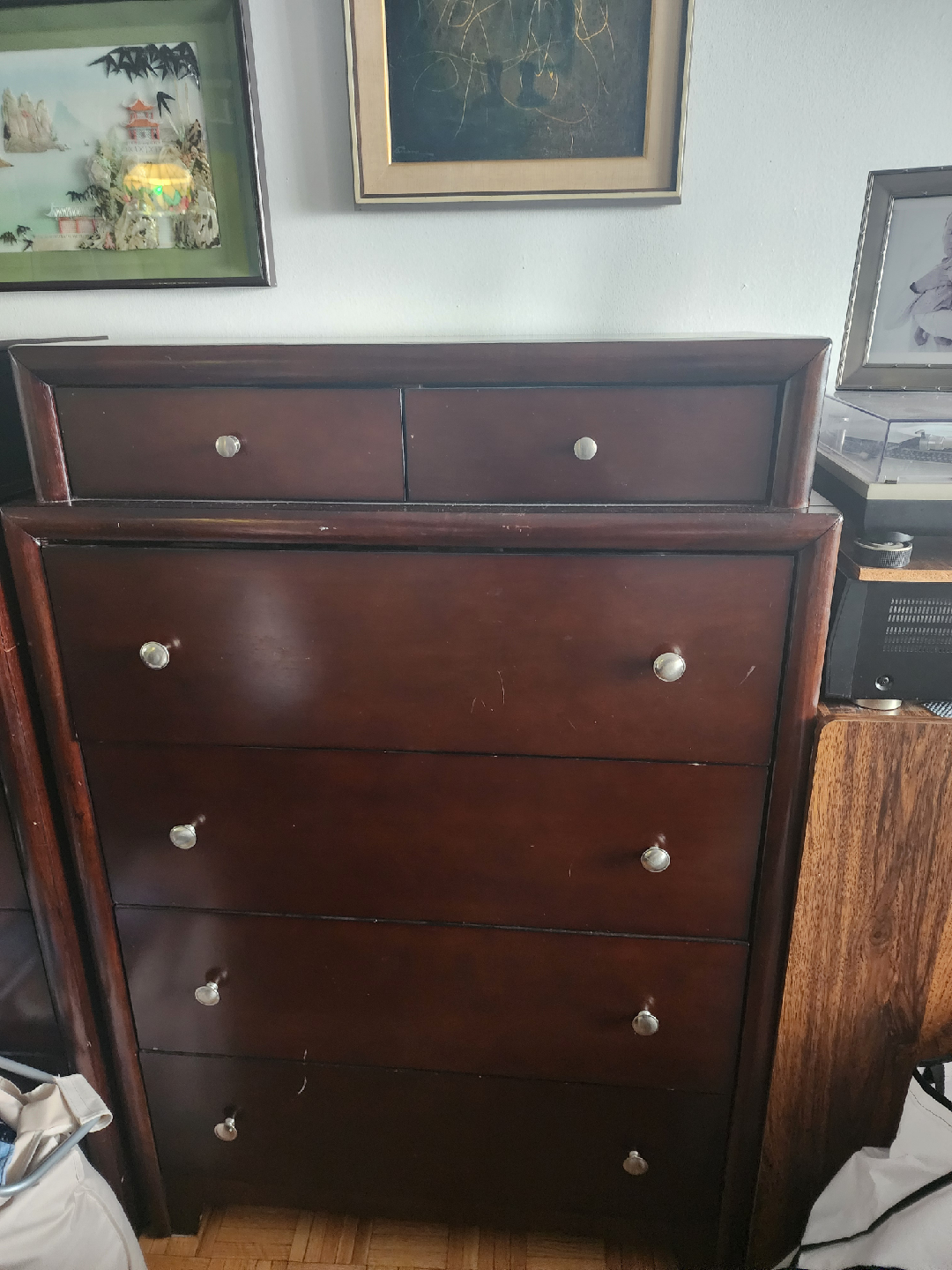 3 piece solid wood dress set with two jewelry drawers on each piece. bought for 3000.0 in excellent condition with silver knows selling to make room to big for apartment. dark brown. asking 1000.0 for set. series buyer only. price negotiable.