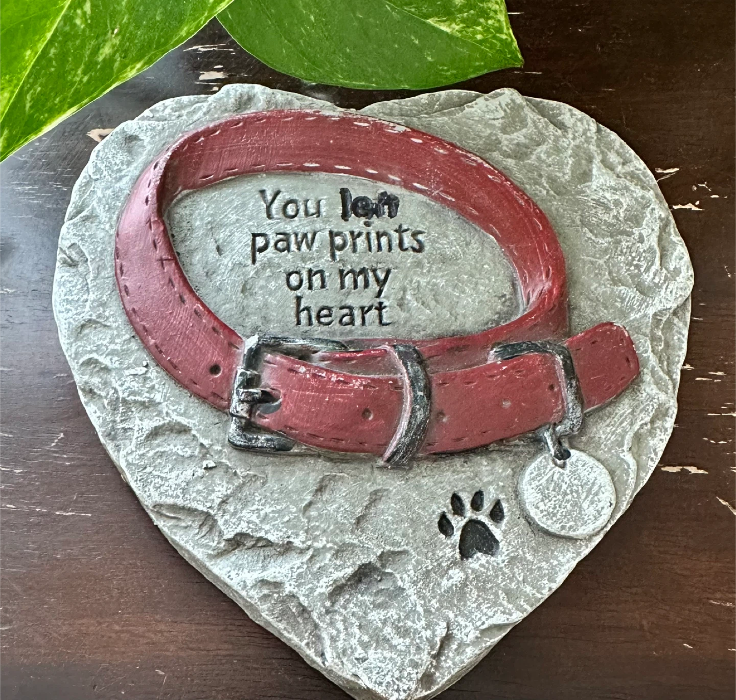 Selling a sweet memorial stone to remember your furry friend. It features a red collar design and the touching phrase 'You left paw prints on my heart'.