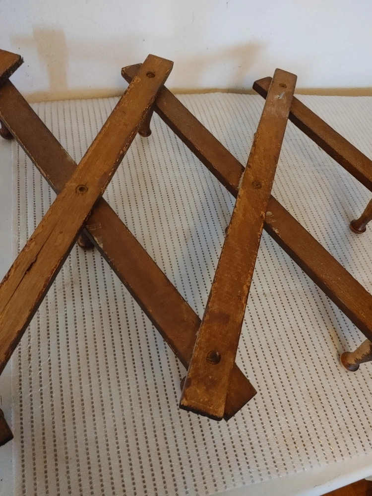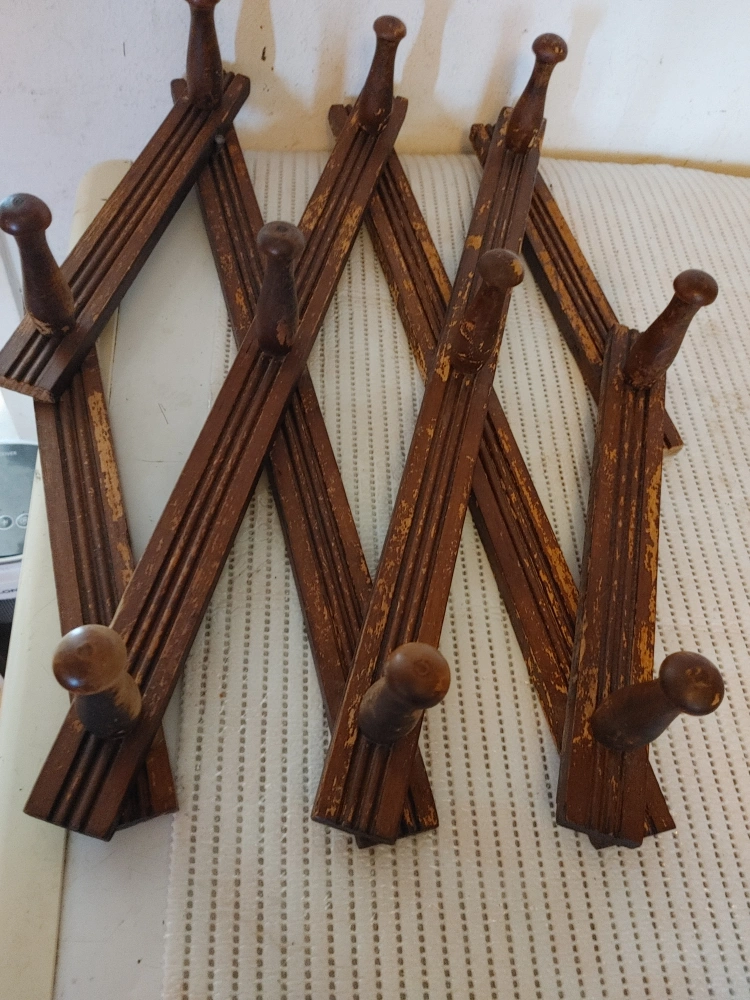 Selling a wooden accordion-style coat rack. It's in used condition, with some wear and tear visible in the photos. Perfect for adding a rustic touch to your entryway or closet!