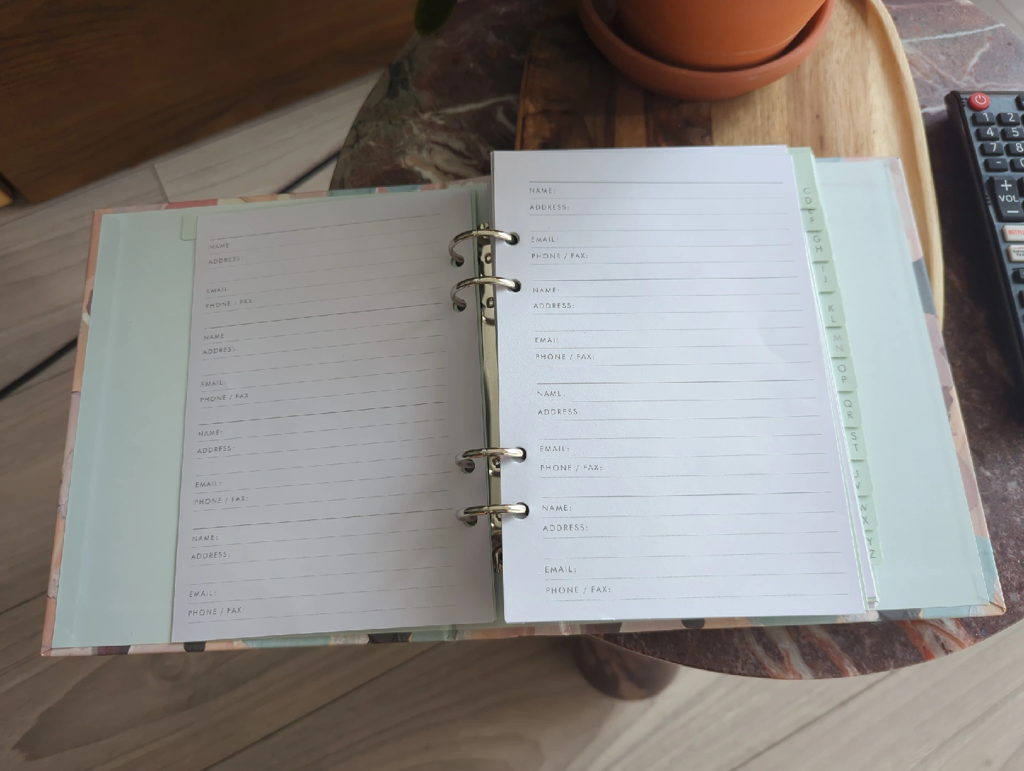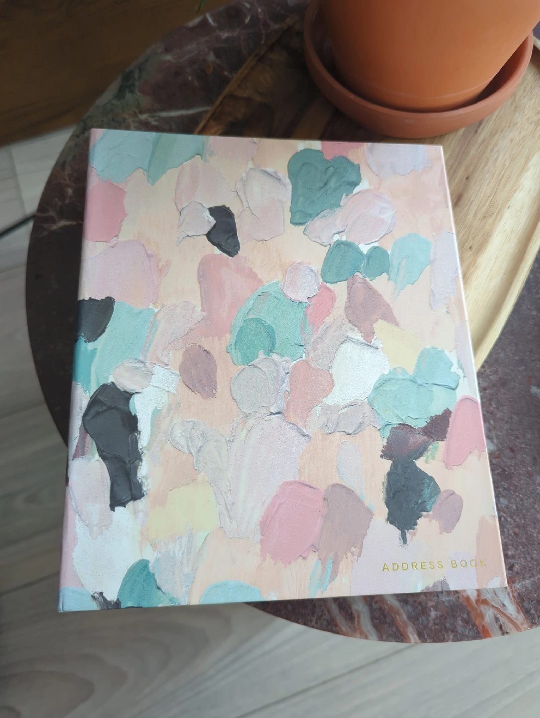 Selling an address book with a pretty pastel cover. It's a ring binder style, and the pages are all lined for names, addresses, emails, and phone numbers! Perfect for keeping all your contacts organized