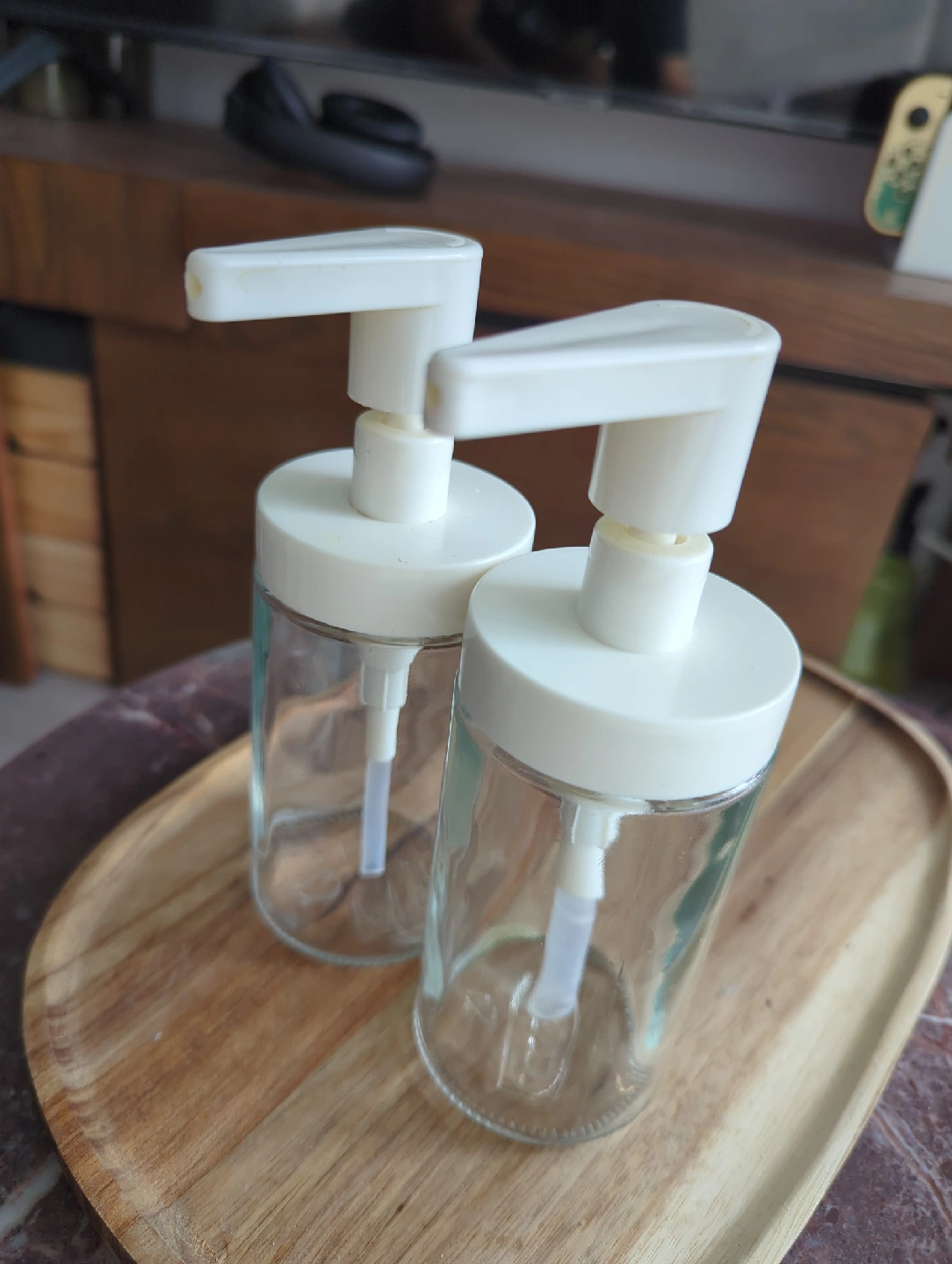 Selling a set of two clear glass soap dispensers with white pumps. They're perfect for adding a minimalist touch to your bathroom or kitchen. They're in great condition and ready to use in your home