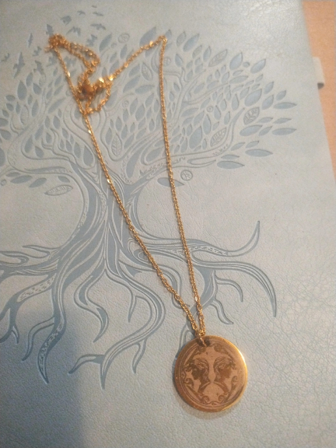 1000+Selling a lovely gold-tone necklace! It features a delicate chain and a round medallion pendant with a unique design. The necklace is in great condition and would make a wonderful addition to any jewelry collection! horoscope: gemini